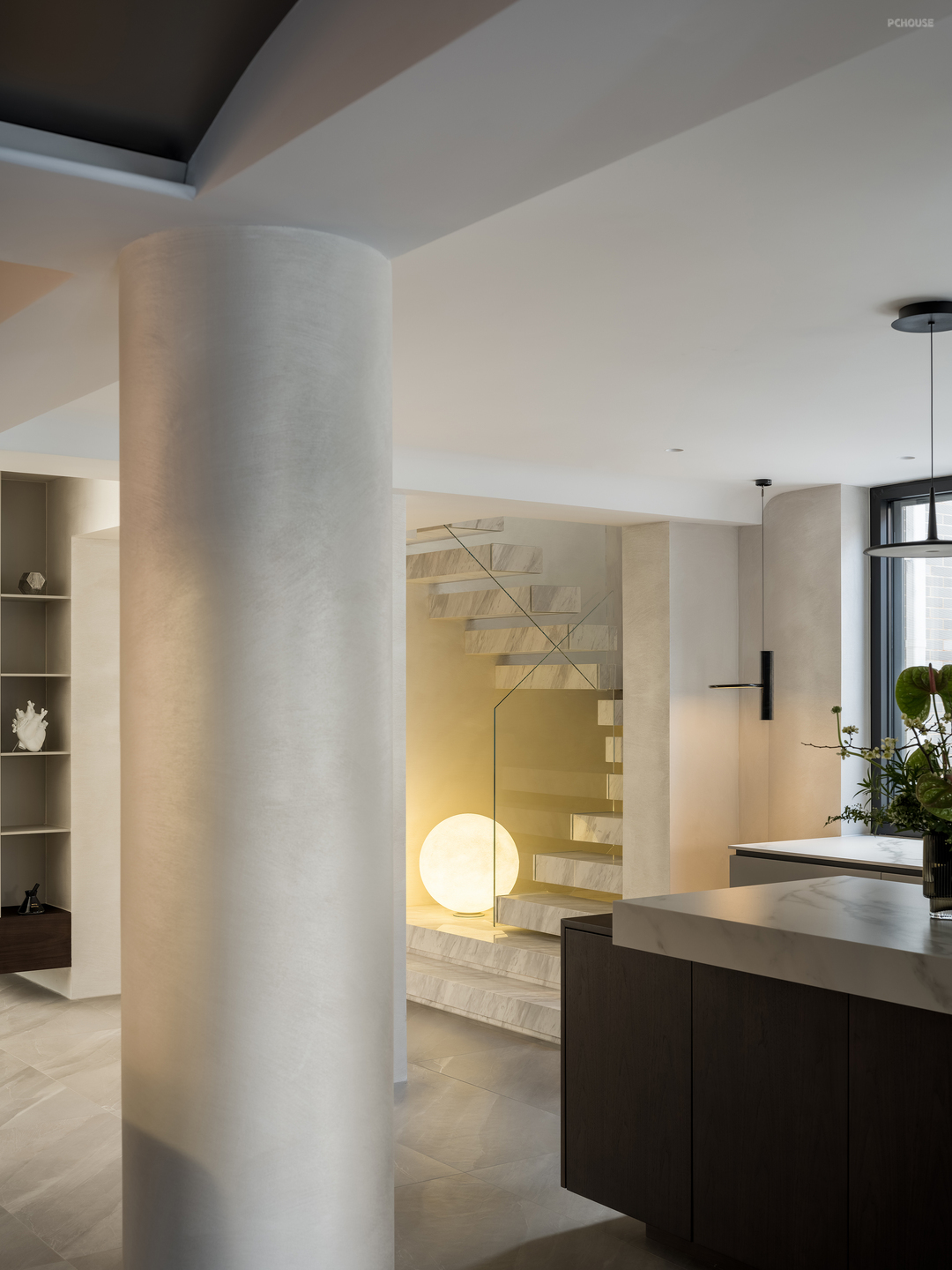悬浮楼梯的设计是本案的一大亮点,将原有的楼梯位置移挪后更利于空间整合,考量后选择将楼梯落座于一层玄关卧室与中岛之间,利用层层悬浮的踏板+全透明玻璃扶手来实现视觉上的松弛感,更显轻盈与和谐。 #楼梯 #踏板 #扶手 #悬浮楼梯