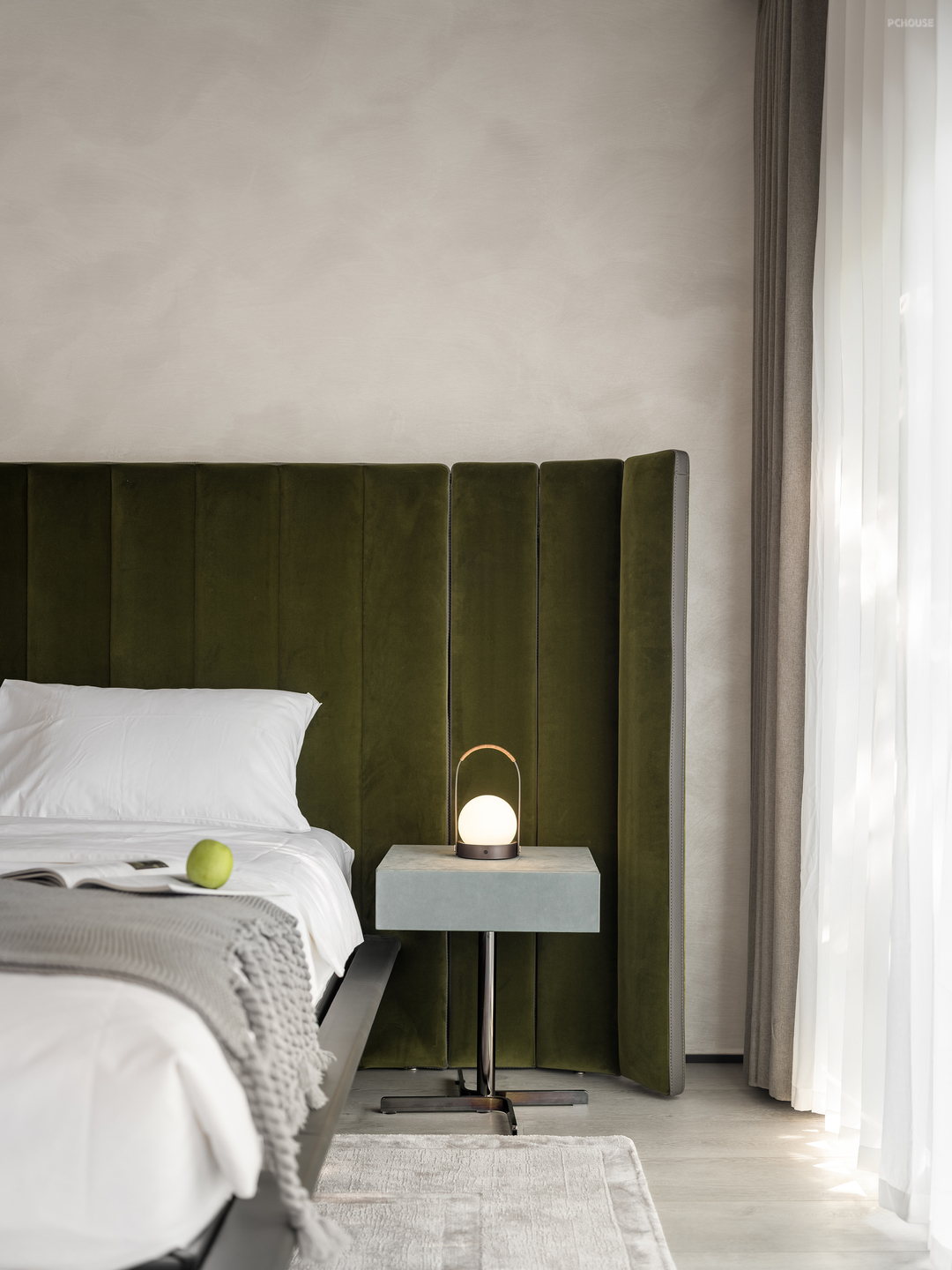 呼应不规则的曲面吊顶,我们在背景墙上也做了些不一样的设计,丝绒橄榄绿硬包墙裙为空间带来华丽内敛的气质,同时也可作为床头靠背,提升屋主使用感,而尾部我们选择利用其特性做成折角曲面,将平面变为立体,加深空间“不规则的美感”,打破呆板,多些不一样的惊喜。 #卧室 #床头背景墙 #落地窗