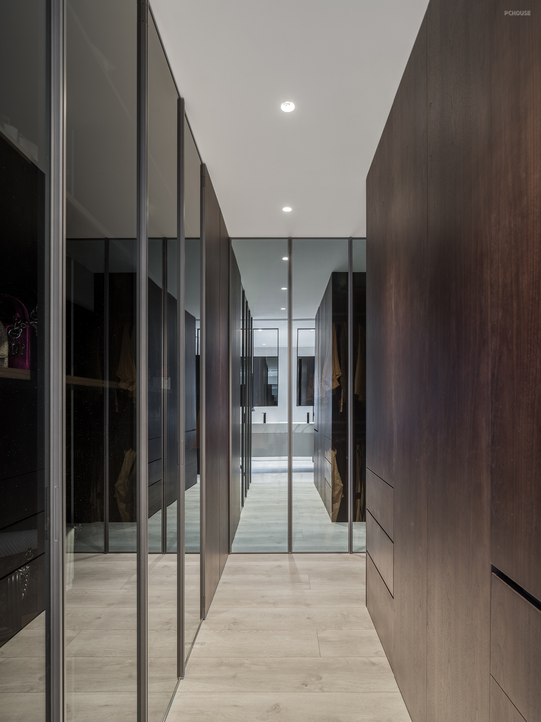 衣帽间的设计也遵循简洁大气的原则,考虑到走道较为狭窄,我们一侧柜面选用黑色玻璃柜面,利用其清晰的镜面反射特质,减弱逼仄空间的压迫感,另一侧则是胡桃实木柜面,沉稳敦重的质感奠定空间气质,“虚”与“实”的结合,碰撞出各异却和谐的视觉效果,实用且大气。 #衣帽间 #衣柜 #收纳