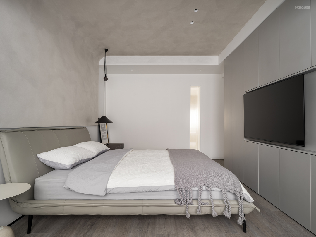 二层为长辈房,整合了原楼梯及洗手间、储物间,打造一个面积宽敞视觉舒适的睡眠空间。因为二老喜欢看电视,所以选择在对面墙定制衣柜的同时预留出电视机位,严丝合缝的嵌入式机位让整体观感干净利落,背后空间也没浪费,同样打造收纳柜,增加储物容量。 #卧室 #吊顶 #床头背景墙 #衣柜