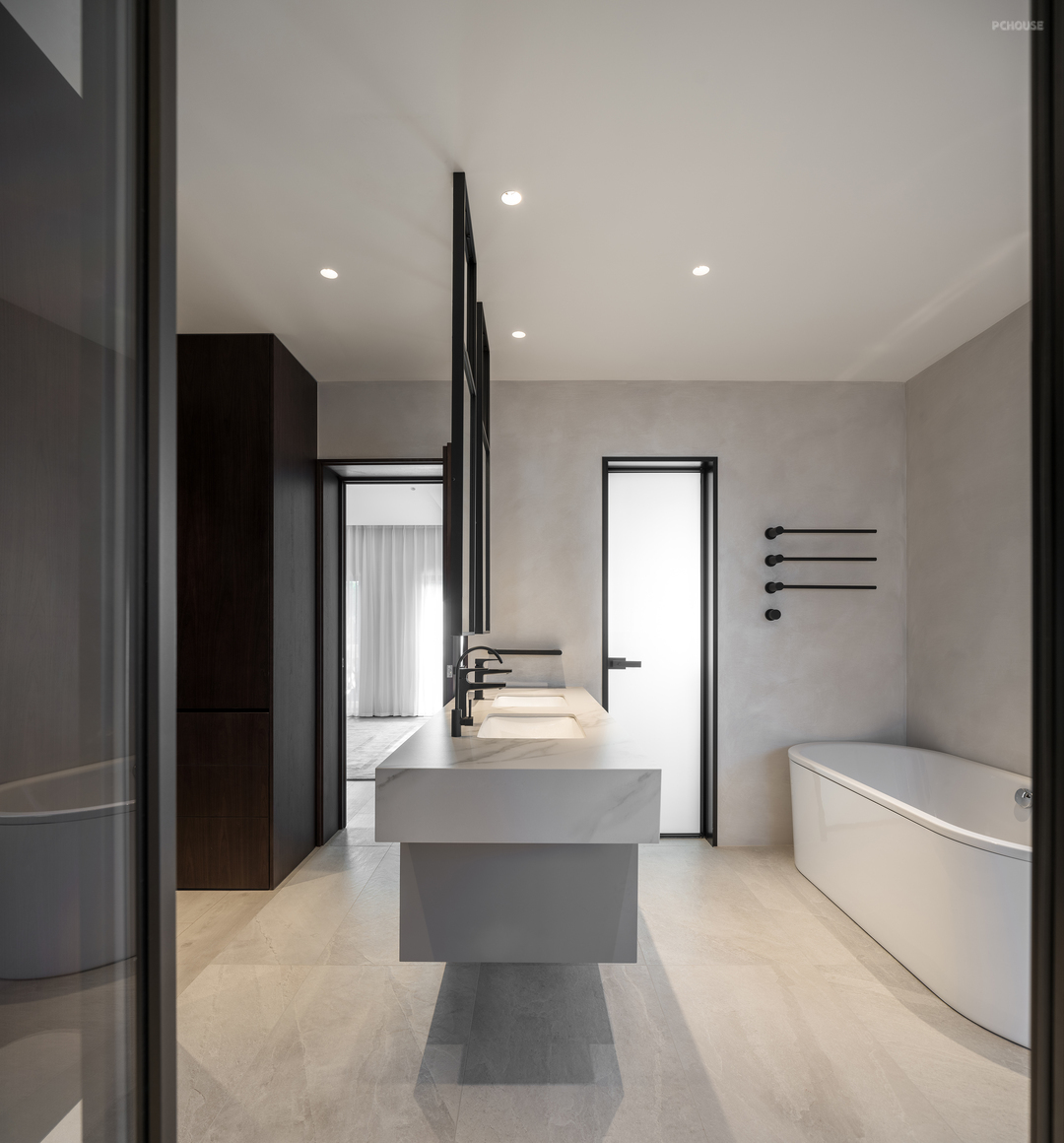 洗手间选择三分离式布局,门体及动线灵活流畅,右侧磨砂玻璃门通向外面楼梯,左侧连通主卧,同时与衣帽间之间也有移门连接,多条动线更为便利,提升屋主日常居住使用感。 #洗手间 #干湿分离 #三分离 #洗手池 #浴缸