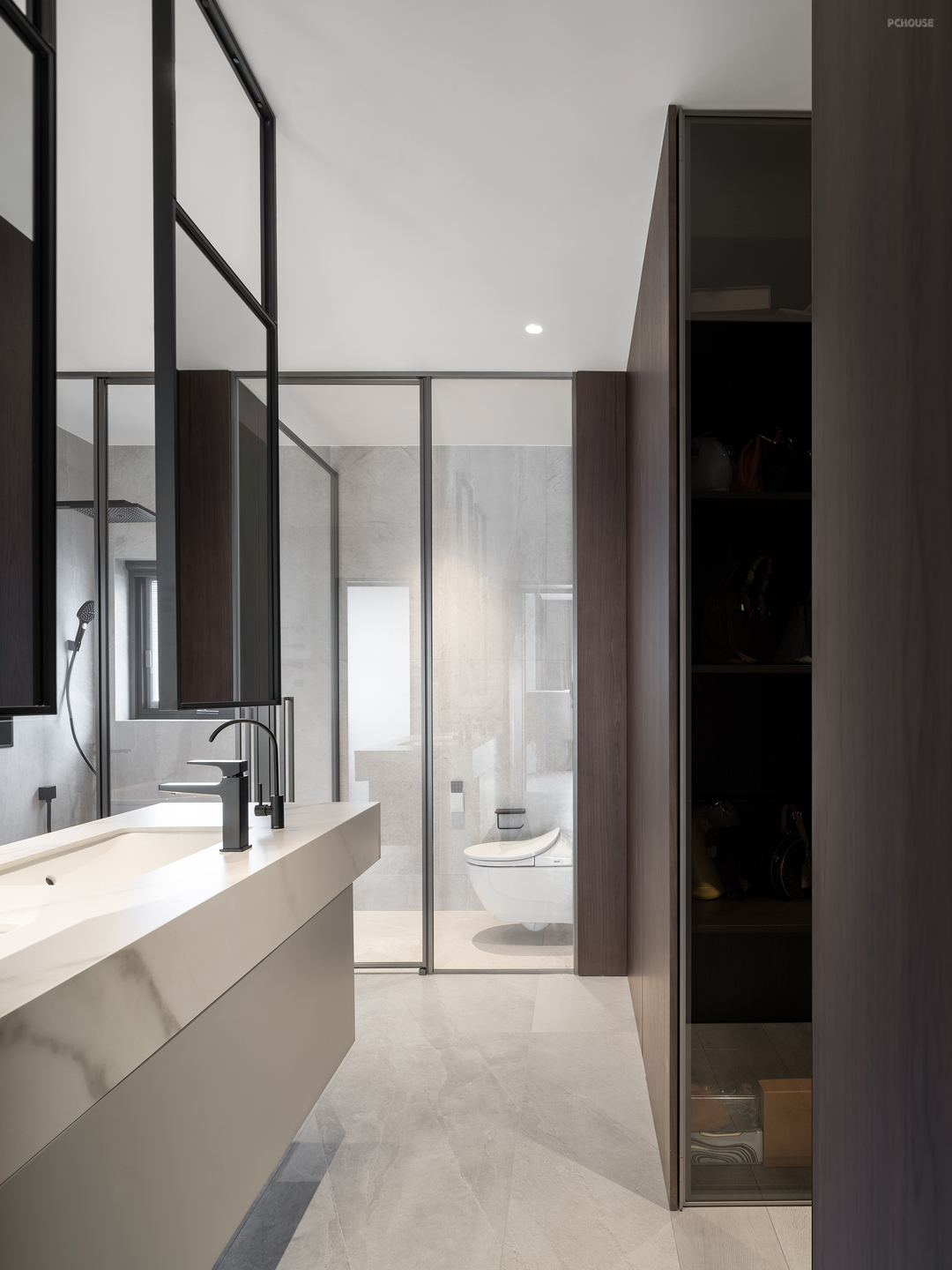 淋浴间与马桶区各自独立全透明玻璃隔墙,在视觉上尽可能做到“无”,让淋浴区采光能进入马桶区,空间采光无死角,使用感更为舒适。淋浴间内定制壁龛,方便放置洗护用品等,不过多占据原有空间,简洁且实用。 #洗手间 #干湿分离 #三分离 #洗手池 #玻璃门