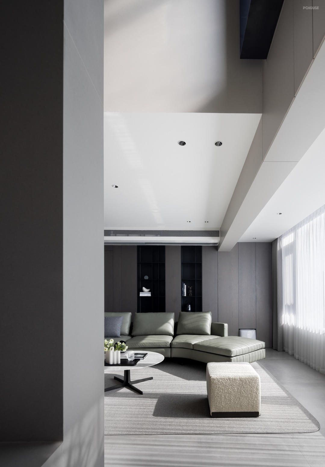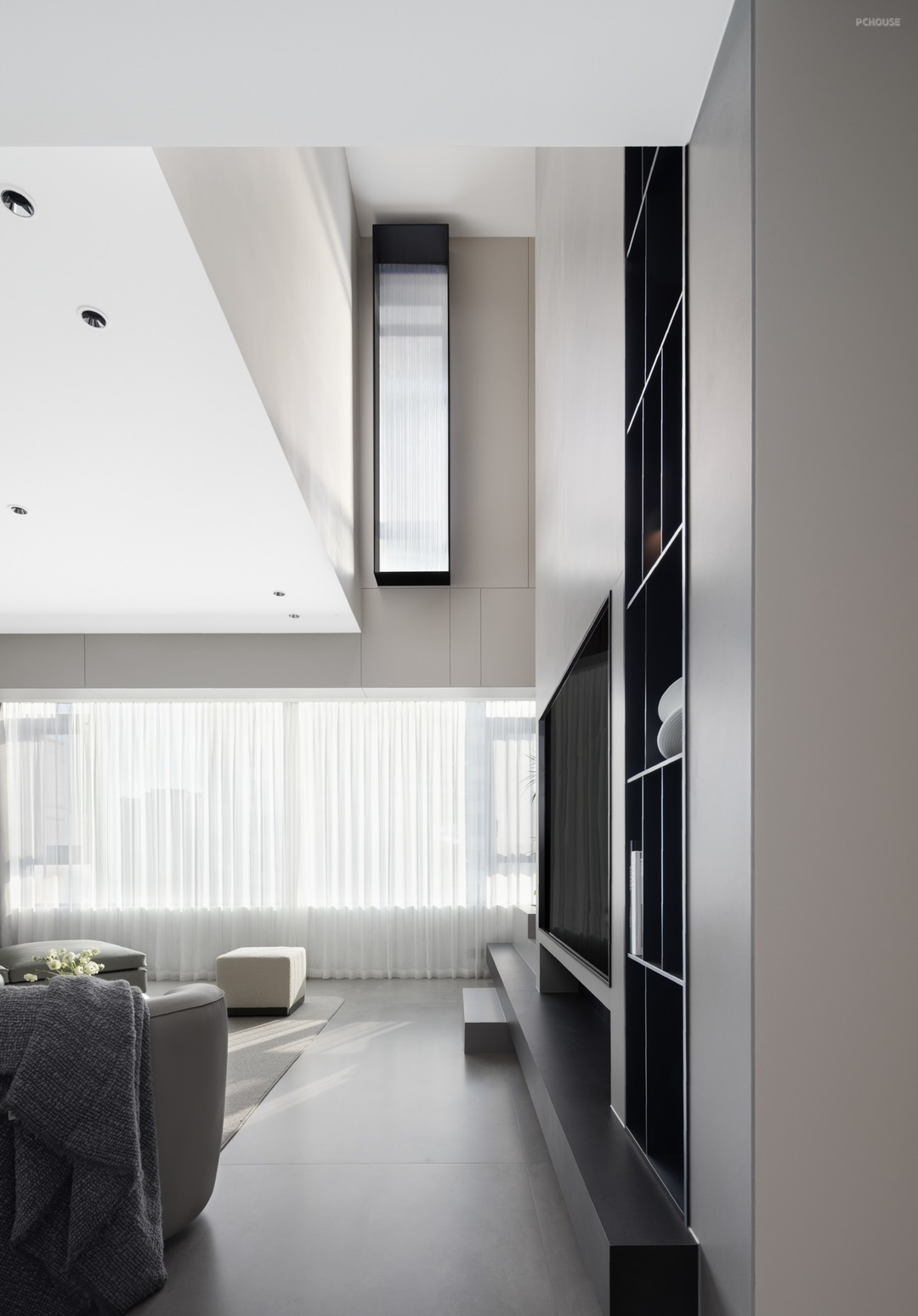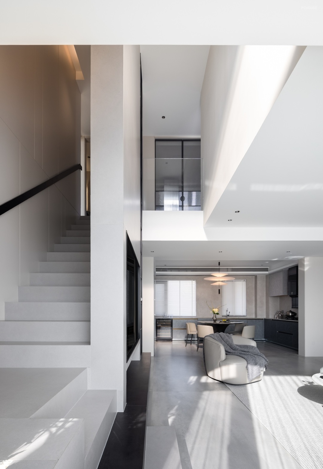 电视背景墙延展向上,与二层形成视觉链接,体现整体感的同时又极具建筑般的张力,北侧引入玻璃采光,丰富空间明度,形成贯穿的光线体验,在一日不同的时间下,光影缓缓移动变换,即使身处钢筋混凝土的森林,亦能感受来自自然最直接的悸动。