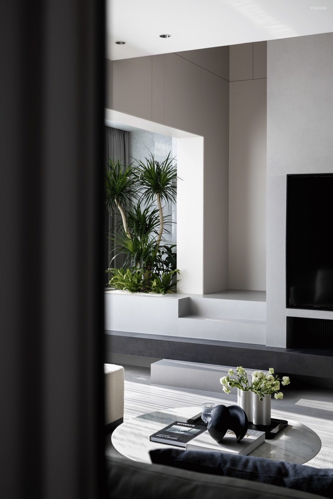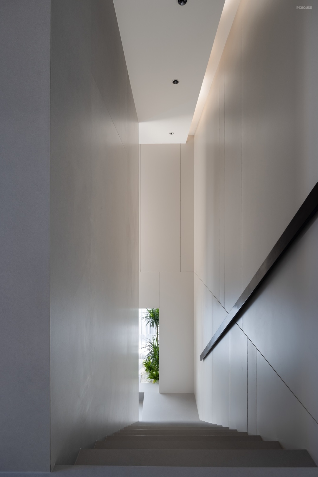 空间内与外的关系,被墙角自然生长的绿植模糊,枝桠够向室外的光源,赋予静态空间蓬勃向上的生命力。