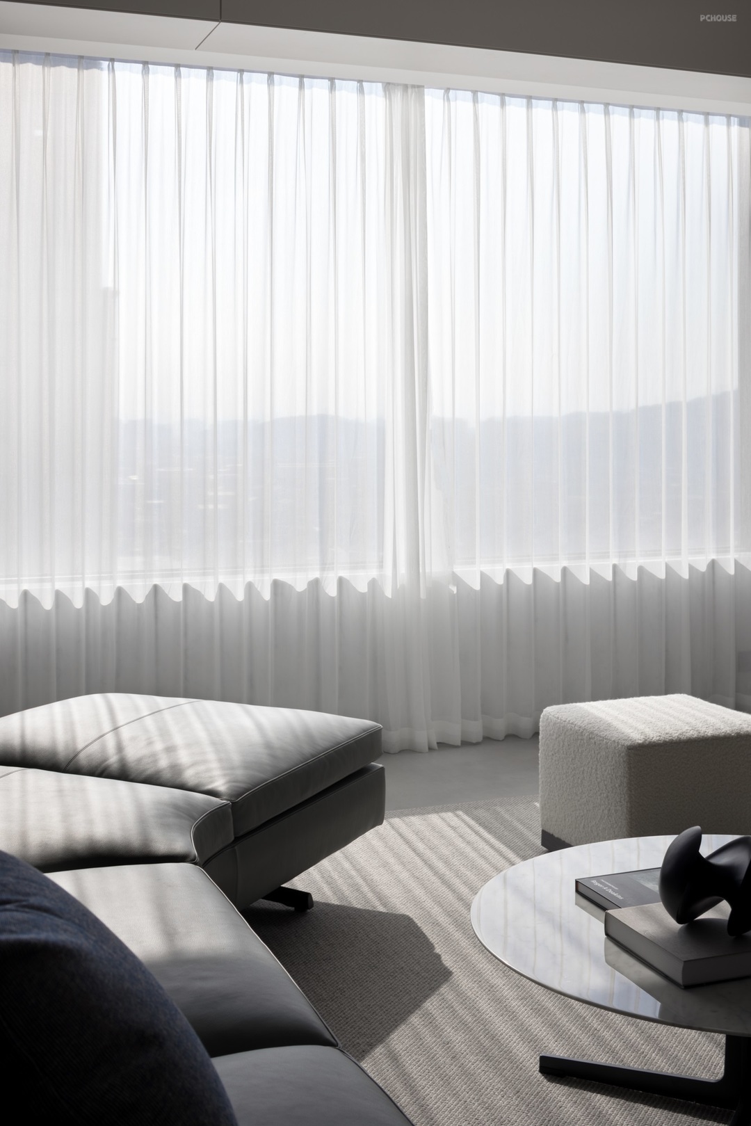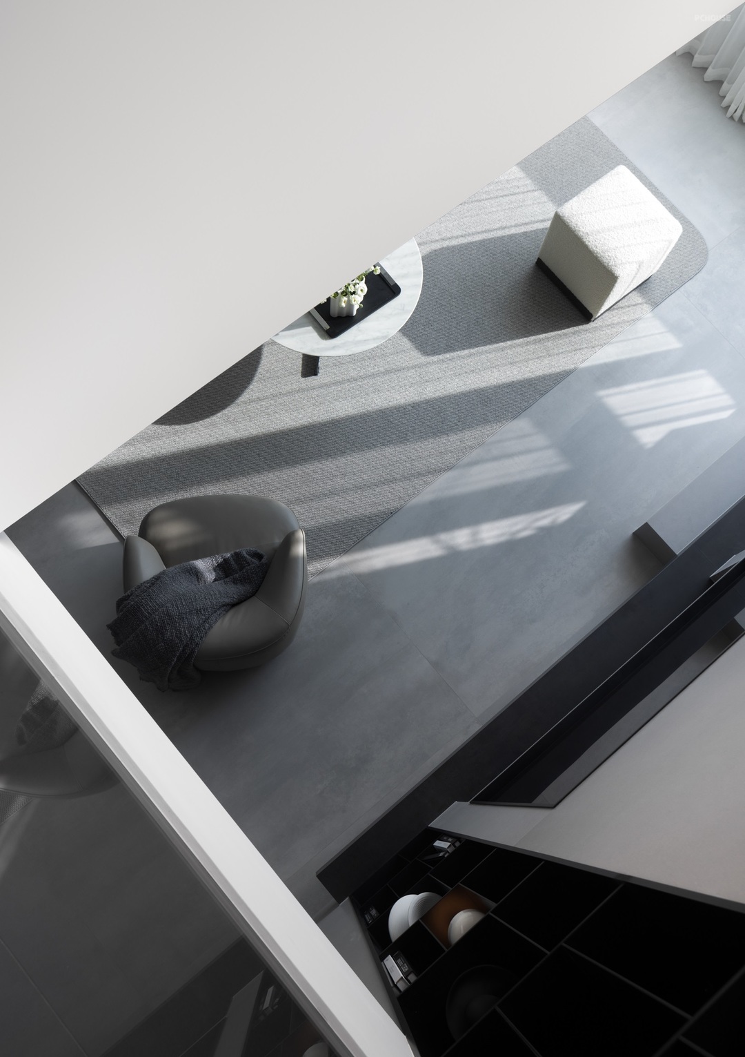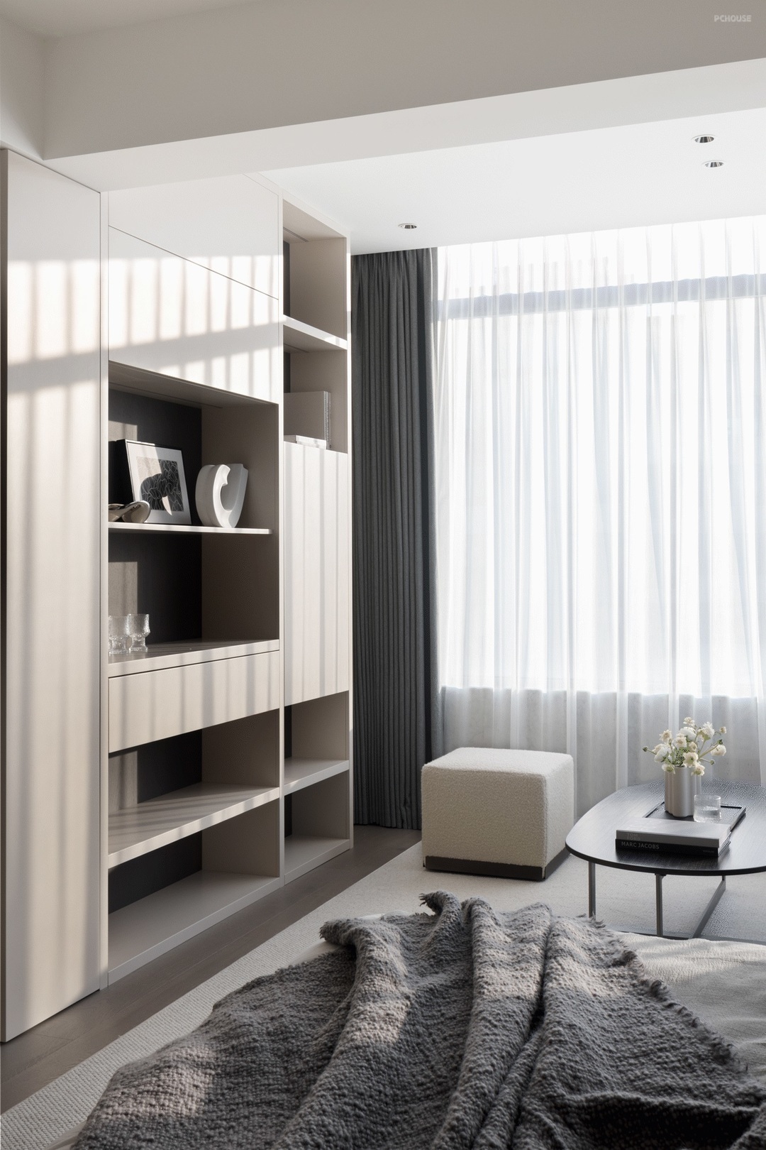以敞开的姿态迎接光线的汇入,物体间不同的材质肌理被光的语言放大,彼此间显得层次分明,刚柔兼具。简单的黑白灰色系填入,极简的外观下,裹藏的是精致而丰沛的内在精神。