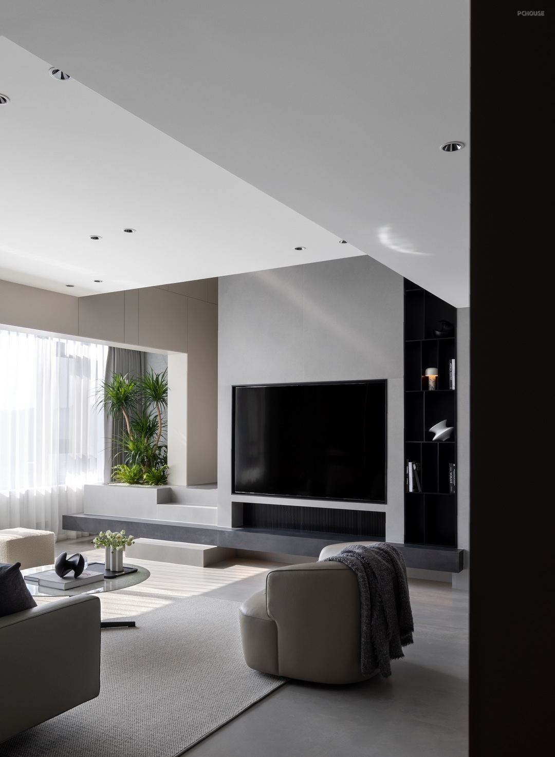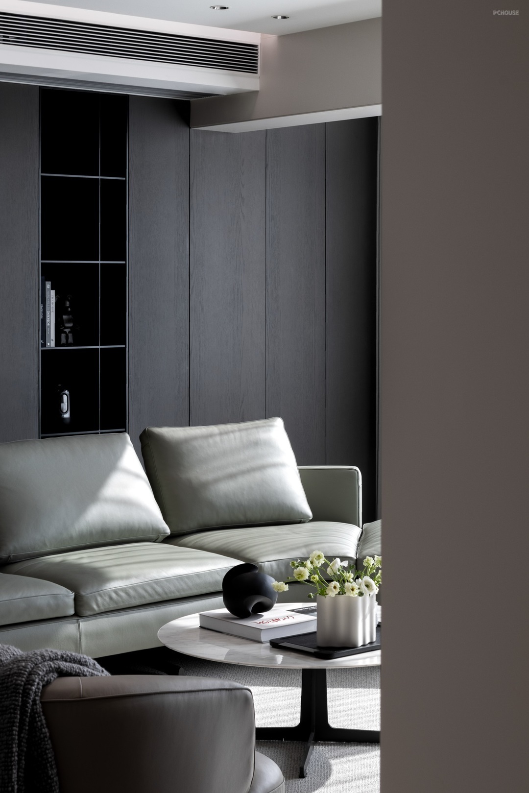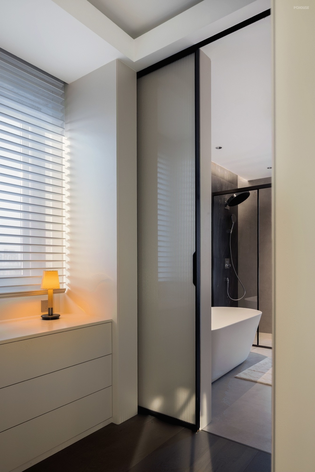 以敞开的姿态迎接光线的汇入,物体间不同的材质肌理被光的语言放大,彼此间显得层次分明,刚柔兼具。简单的黑白灰色系填入,极简的外观下,裹藏的是精致而丰沛的内在精神。