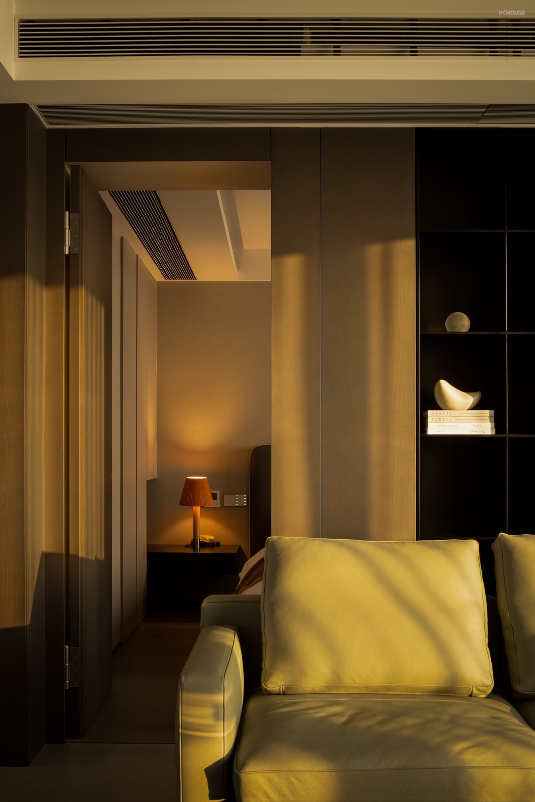 铺陈更为清浅的色调,承载洁净惬意的氛围感受,通过柜体的延展,为休闲区域提供置物的可能,闲暇时刻,安坐于窗边看城市明灭的灯火,别具意味。