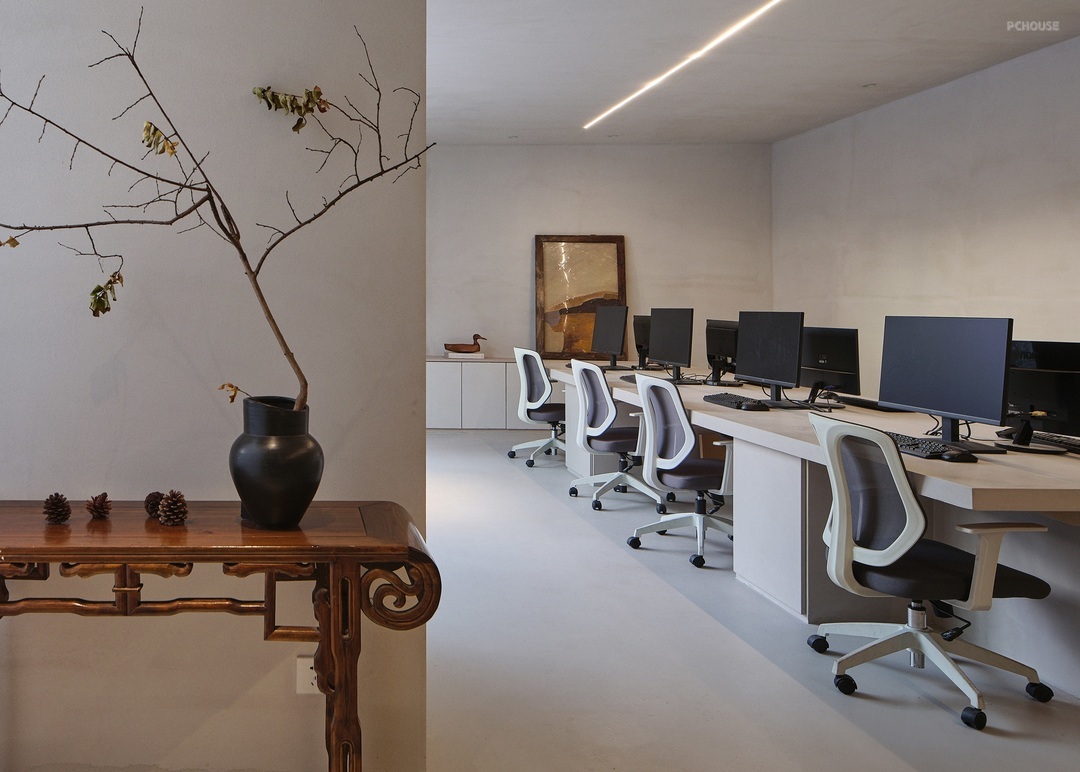 另一侧则作为前台布置,桌面依据梁柱而设,形成L字型结构,与沙发成合围之势,人于空间中任意就坐,处处成景。