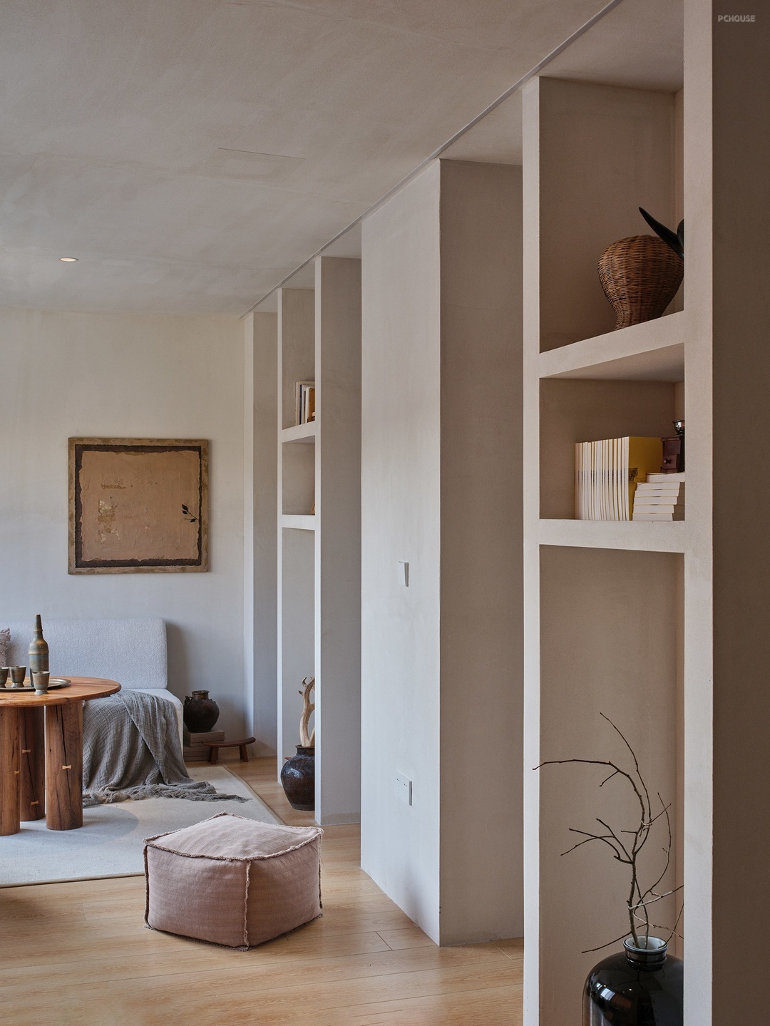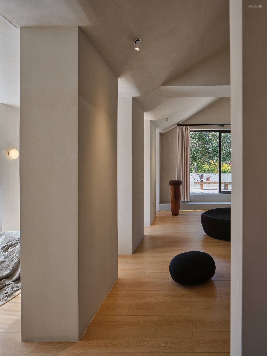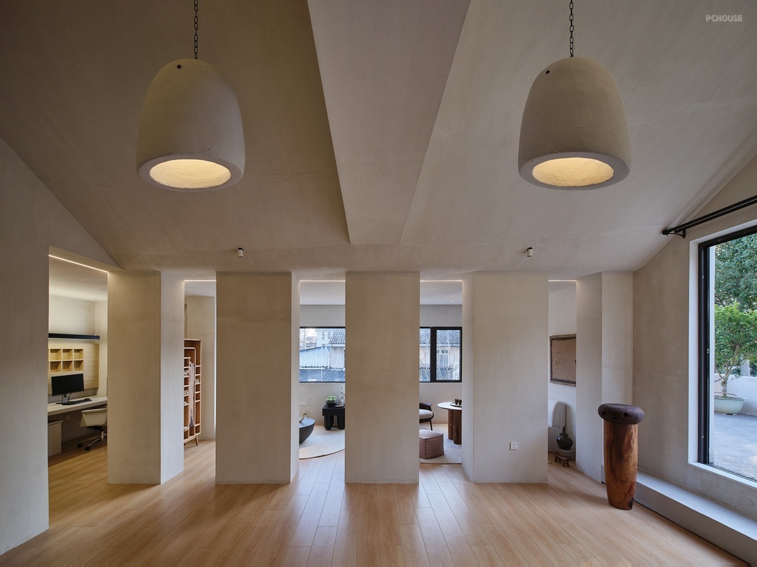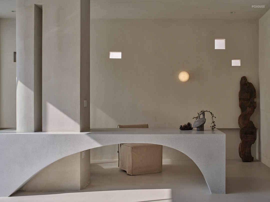 在墙面讲究纯粹的素净之后,我们试图用结构表现来丰富空间的层次。规划光线的通过路径,形成层次分明的影,此时当人处于其中的时候,能够感受到阳光东出西坠过程中,在地面上形成的不同的影,于是空间便有了栩栩如生的生命力。