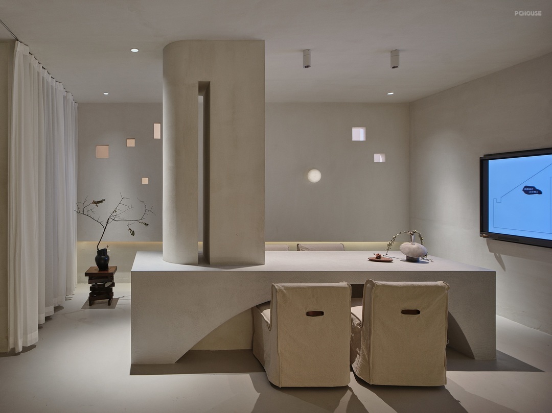空间不做打断,以敞开的形式彼此透视,去掉了“门”这一基础属性,取而代之的是错落的立柱,与空间结构本身的块面几何。二层中心区域的组合沙发,如同鹅卵石随意散落,山涧溪流的概念被置于平面之上。