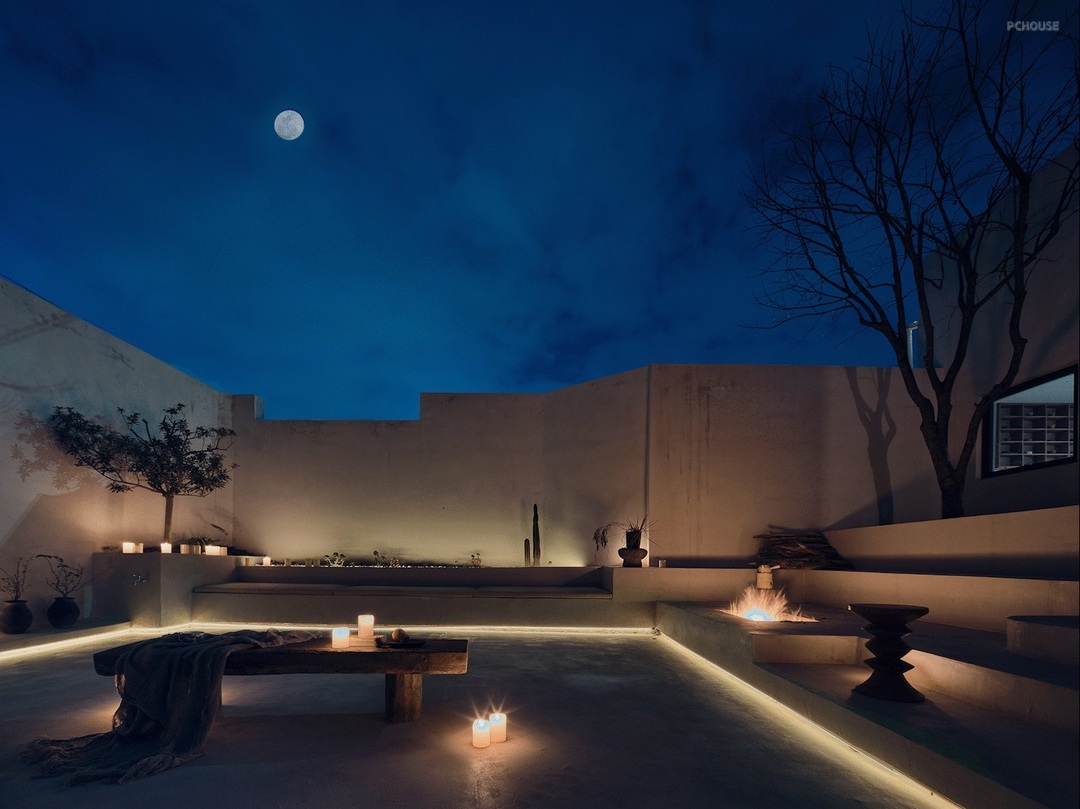 到了夜晚,灯火四起,不同的光晕刻画空间,如勾线描红,以另外一种形式去呈现结构,庭院的意义被重新解读,台阶沿空间的边缘围合而形成落座,高低错落交织,每一处都值得细细感受。