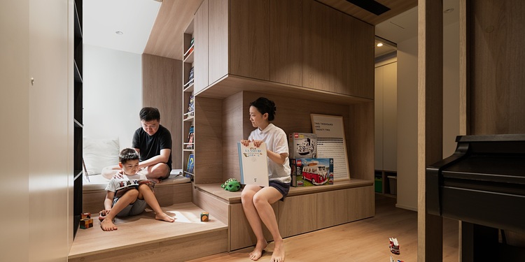 通过木饰面的围合,让空间显得质感更加自然大方,带来简约温馨的感受。床头预留置物空间,小朋友看的书籍和玩具可以随手放置,结合简约的小壁灯,让卧室氛围更有格调。