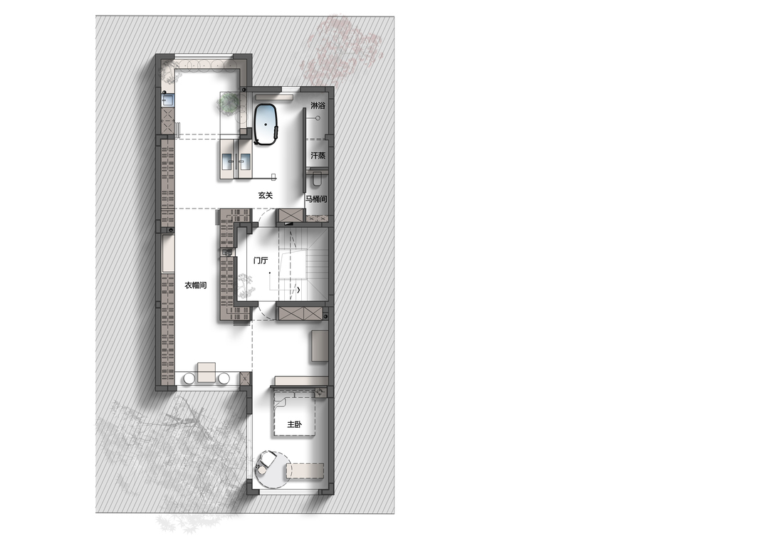 动线做回字形处理,衣帽间居中,连接主卧与洗手间,从楼梯步入套间后从洗手间及卧室均可到达各处,日常行动更加灵活;