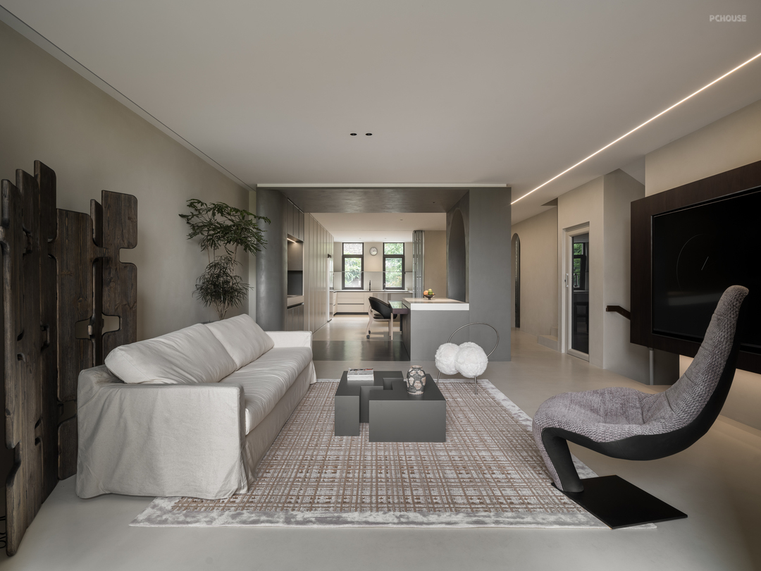 空间布局以侘寂与清简为主,墙地一体选用米灰色调微水泥,材质独有的特性赋予空间统一完整的视觉效果,比起瓷砖木地板之流更具自由之美。