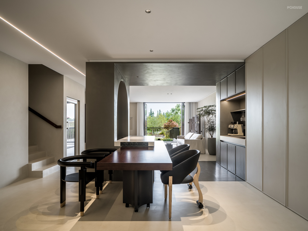 利用其结构,背景墙做镂空拱形隔断设计,拱形造型气质优雅,与定帛拱形靠背餐椅元素契合,背面的阶梯设计恰好能与不远处的楼梯形成呼应,增加空间各处的关联性。