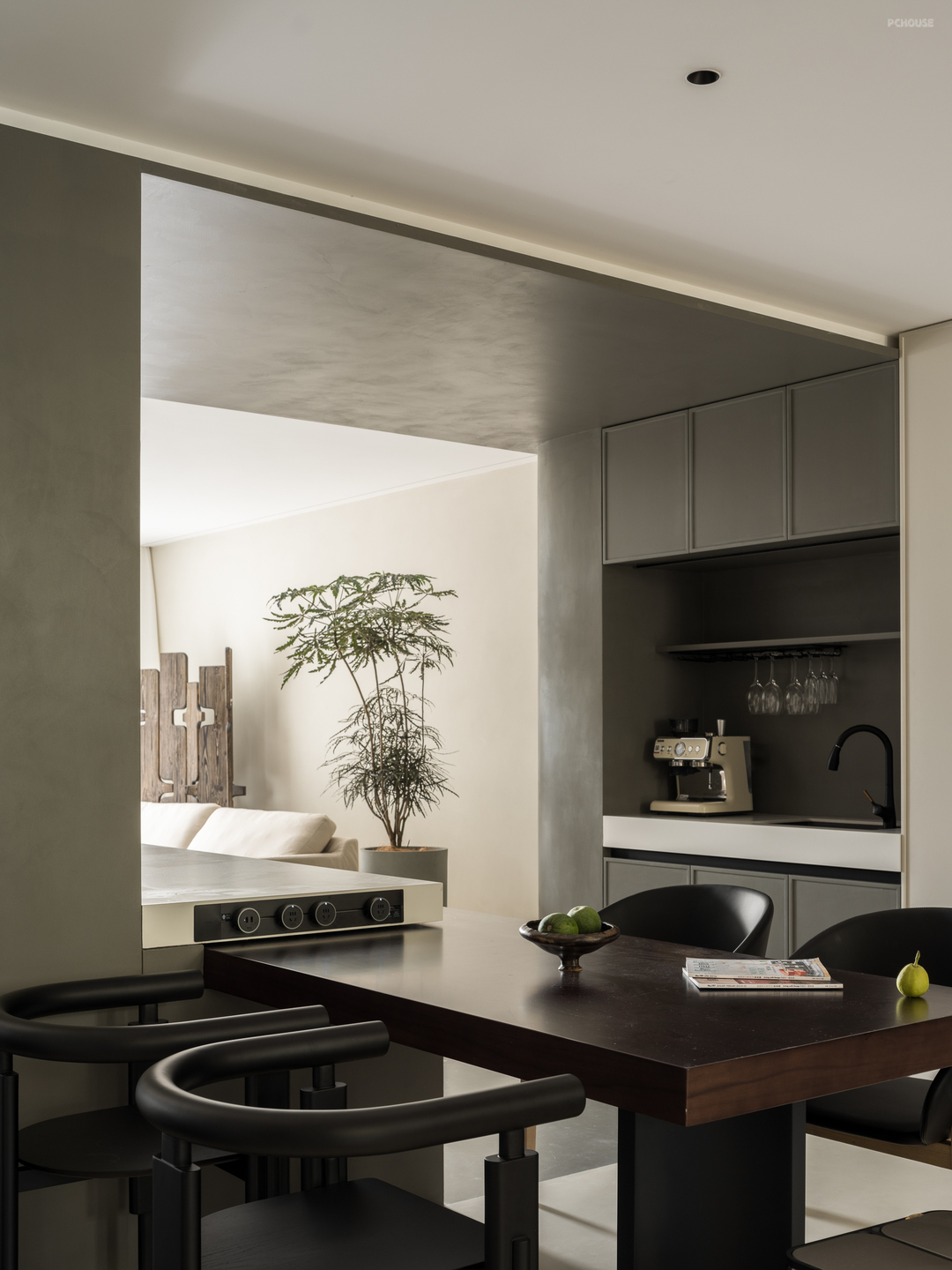 客餐厅连通无界,选用不同色调微水泥做视觉划分,不影响空间视野及采光但规整功能区让其具有秩序感,也丰富空间视感及层次,柜面边缘采用圆柱形收边,过渡自然,空间气质也更显柔和舒缓。