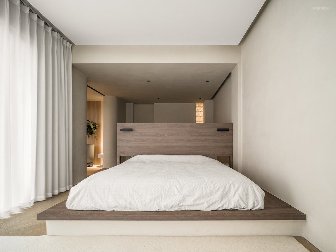 床头背景墙定制床头灯,光线柔和不伤眼,方便起夜使用,下方做镂空处理,增添与其他空间的关联性,更具有呼吸感,侧面宽余床铺的地台设计,代替床头柜功能,便于摆放水杯或是书籍等,从细节处提升便利性。