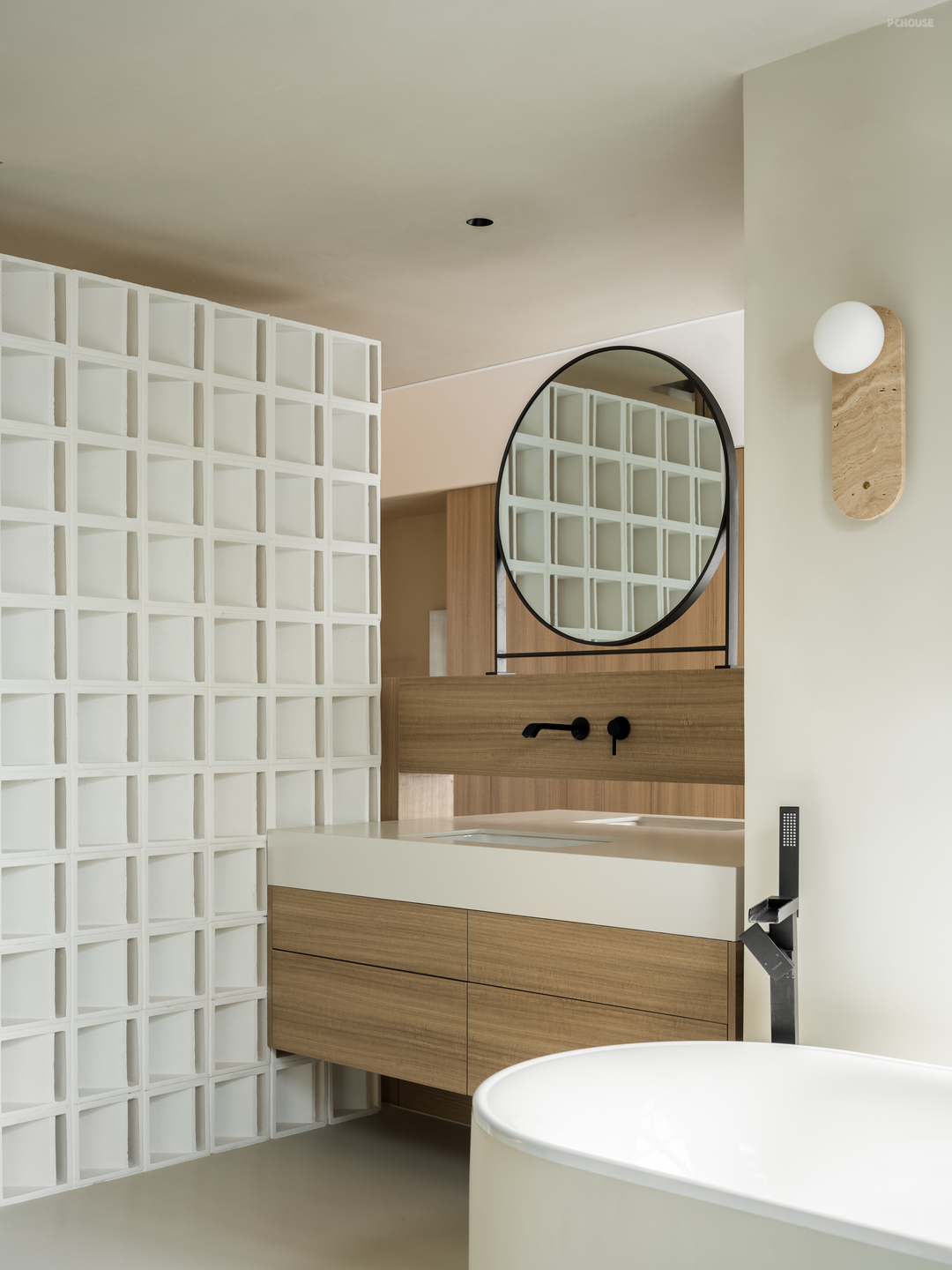 浴室一侧洗手池设计与背面一模一样,视感上保持一致更显简约清爽,侧面采用水泥空心砖做艺术隔断,造型独特且通透引光,更具观赏性。