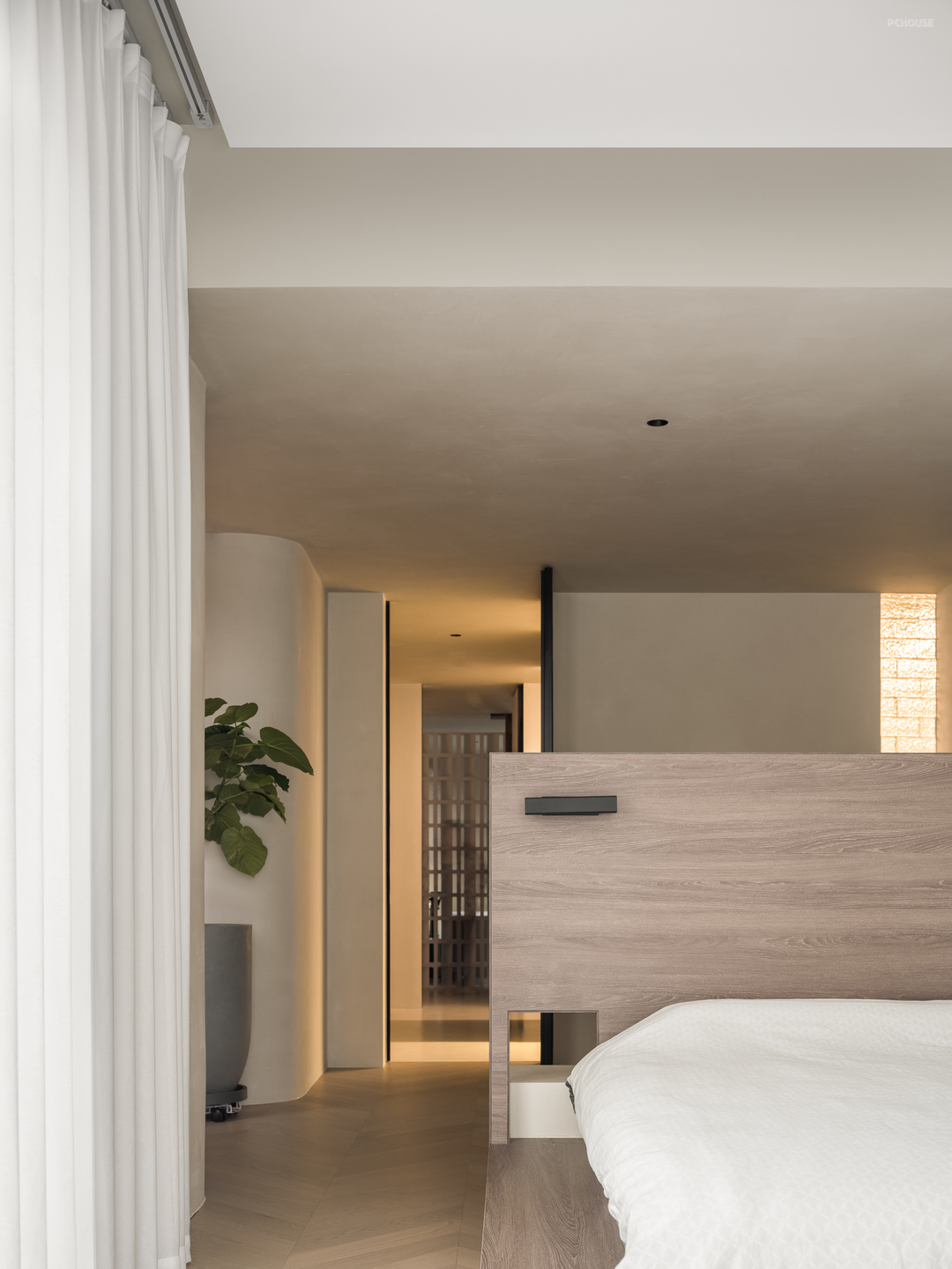 原主卧位于朝南内位置,视野并不好,我们将卧室调整到最南端房间,同时于床尾背景墙打造拱形大幅落地窗,将窗外绿植花叶与湖景引入室内,日升月落,每天都伴着自然美景睡去醒来,给普通平淡的每天增添光彩与治愈系。