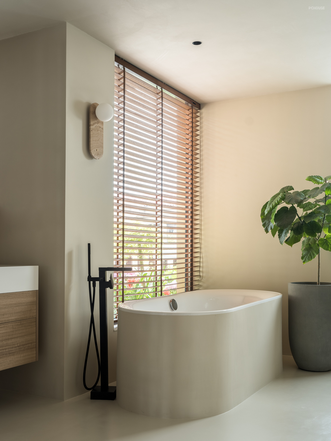落地窗前定制落地浴缸,木百叶帘与空间元素融合,闲适写意。窗外为室外阳台,做绿植花草造景,携着缤纷烂漫的自然景观泡澡,舒适而享受,让休闲时光更为轻松惬意。