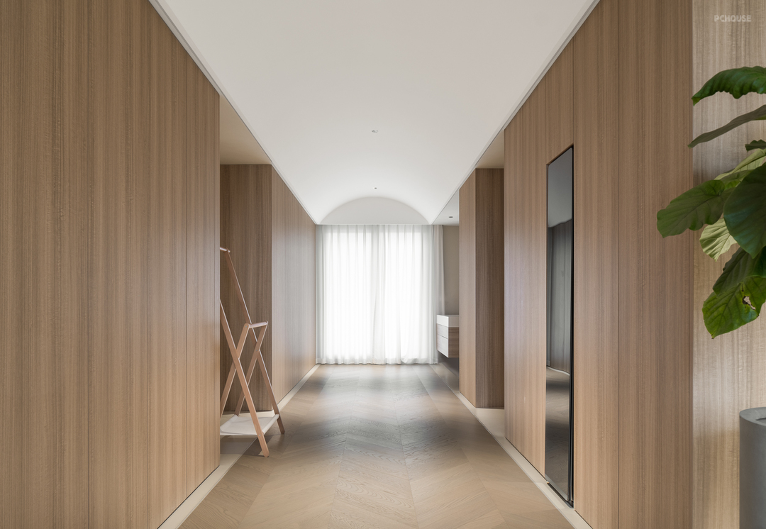 吊顶与二层一样做拱形设计,尽量保证层高的情况下,藏起梁体,兼顾了通透性与视觉美感。衣帽间柜体均采用原木板材,与走道的鱼骨拼木地板形成呼应,打造一个温润柔和的空间,也方便屋主行走,但两侧柜体下方依然选用微水泥,不同的材质展示丰富空间视感,打破单调。