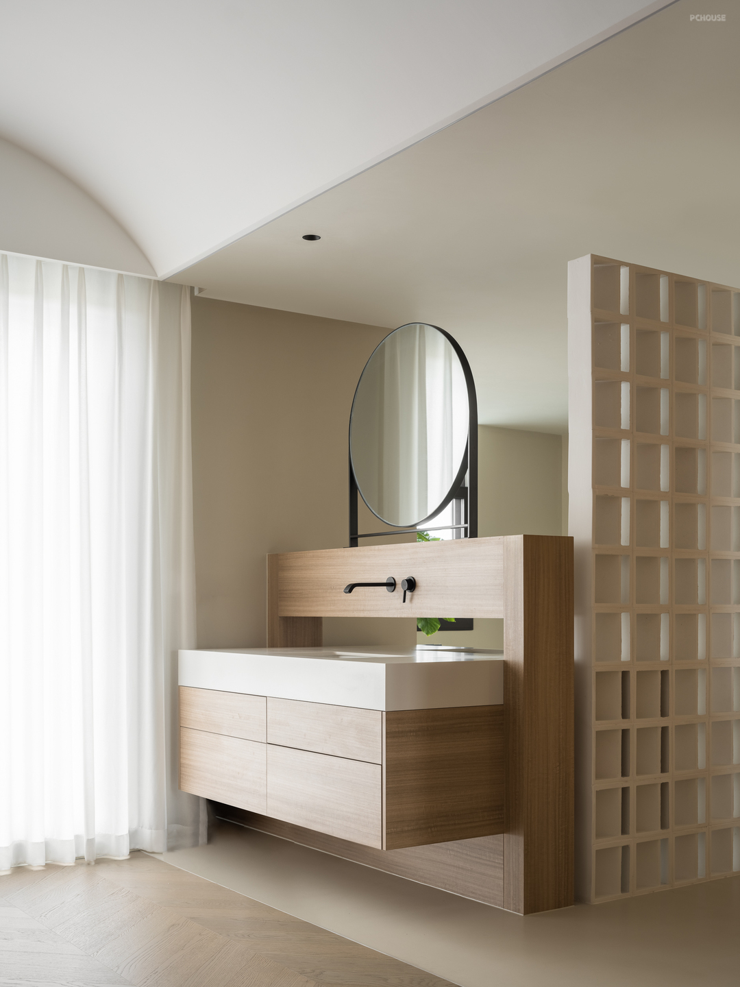 衣帽间与洗手间交界处,两侧均定制台盆,避免日常使用等位。浴室柜同样选择原木材质,与衣帽间形成元素呼应,柜体不落地更显轻盈,上方做镂空隔断,入墙水龙头视感简洁利落,上方一座圆形浴室镜,保证功能齐全且不影响空间通透感。