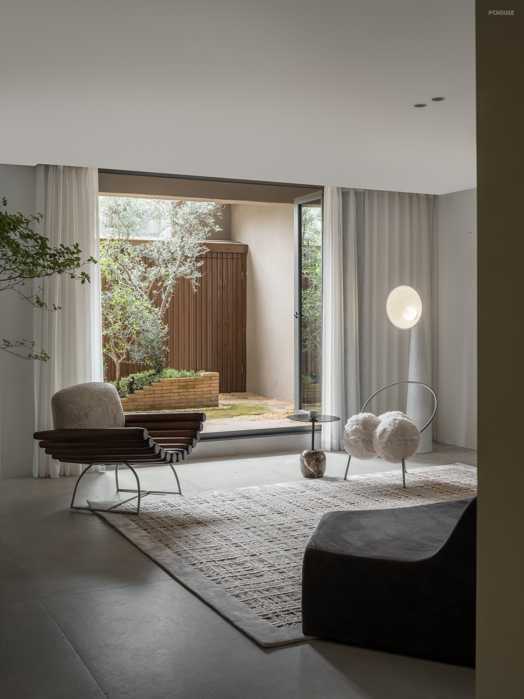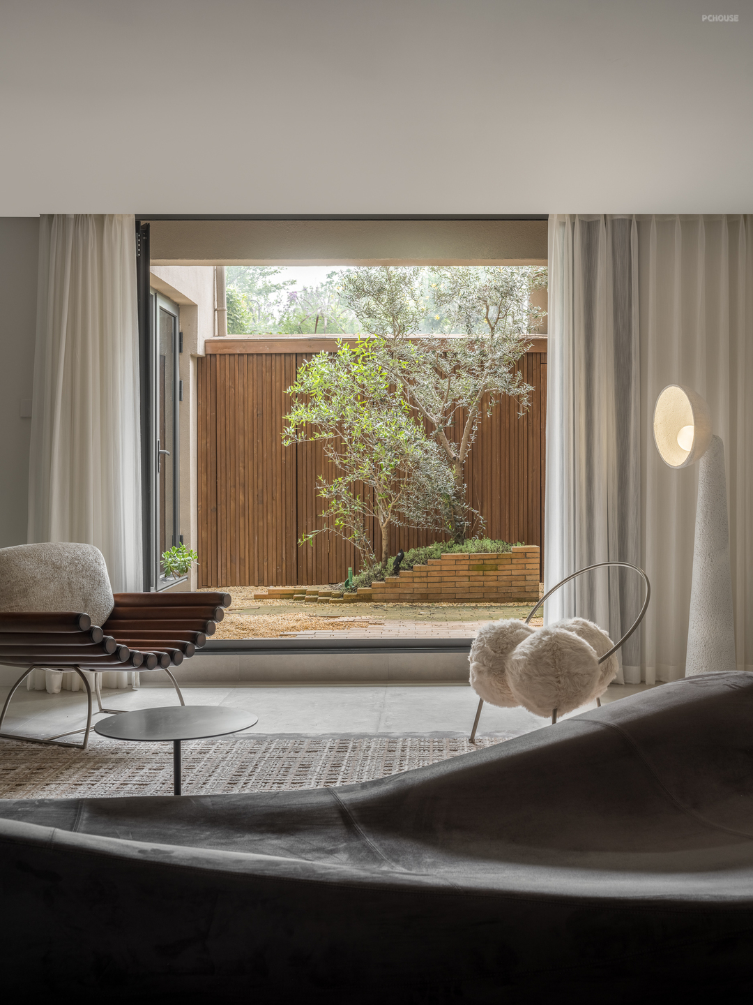 主厅与天井之间安装折叠玻璃移门,在需要时可以收敛起来,让室内外受阻碍连通,增进人与自然的亲近感,无论是雨天听雨、还是午后晒太阳,或是夜间晒月光,此间都舒缓闲适,让时光慢下来,与大自然共生,在呼吸间放慢节奏,以收获安宁。