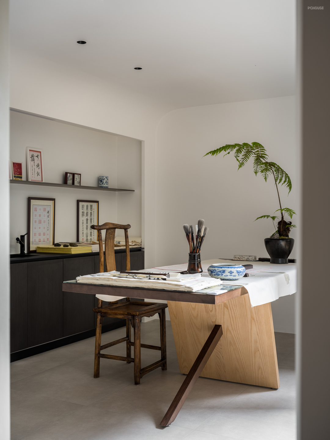 男屋主喜好书法绘画,是以在地下室独立置备一间书画室,作为其练字绘画的场所。书画室侧面与天井之间墙面被拆除,改装玻璃折叠门,既能让书房内部收获明亮的自然光线,也能在静谧安宁的氛围拉近室内与自然的距离,让写字、绘画氛围更写意闲雅,为业主喜好提供最适宜的环境。