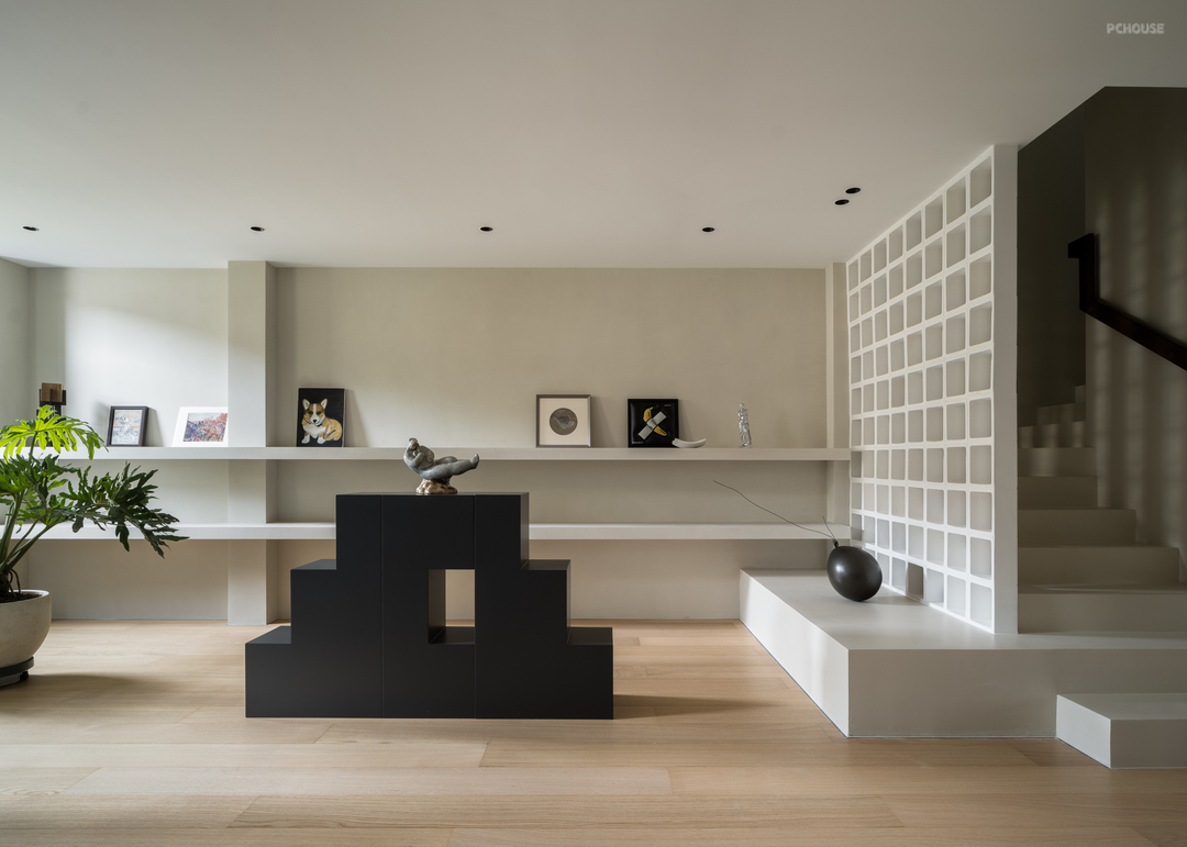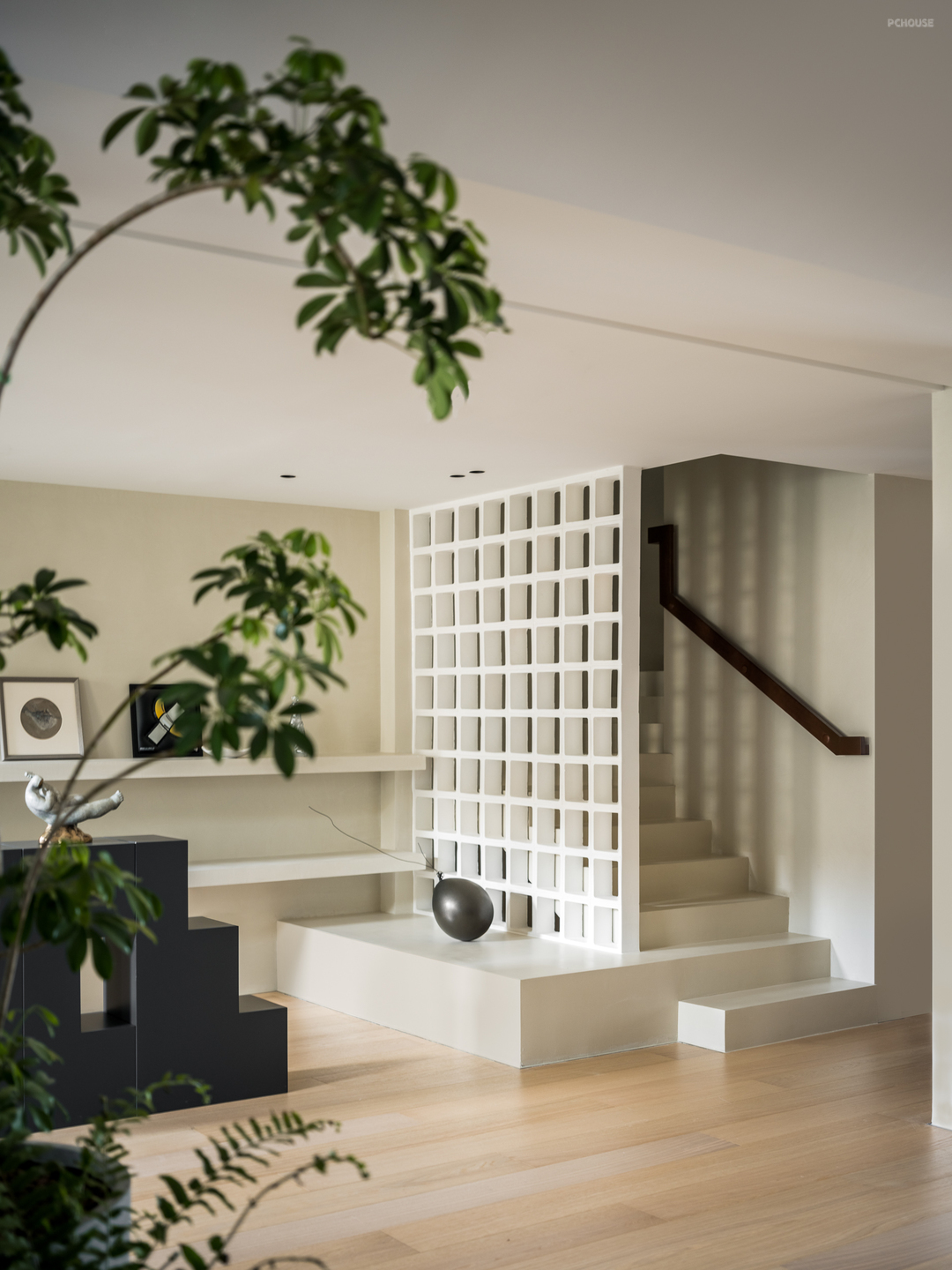展示区与楼梯之间定制镂空隔断,光影浮动氛围静谧安好,构筑一个可以放空享受的艺术角落。