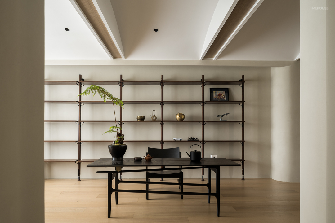 双书桌布局便于屋主夫妻处理自己的工作或是阅读休闲,待在同一空间里忙着各自的事,随意交谈闲聊两句,加班时间也显得更加好过,又或气氛安静,但自然却舒适,这也是另一种家常的幸福。
