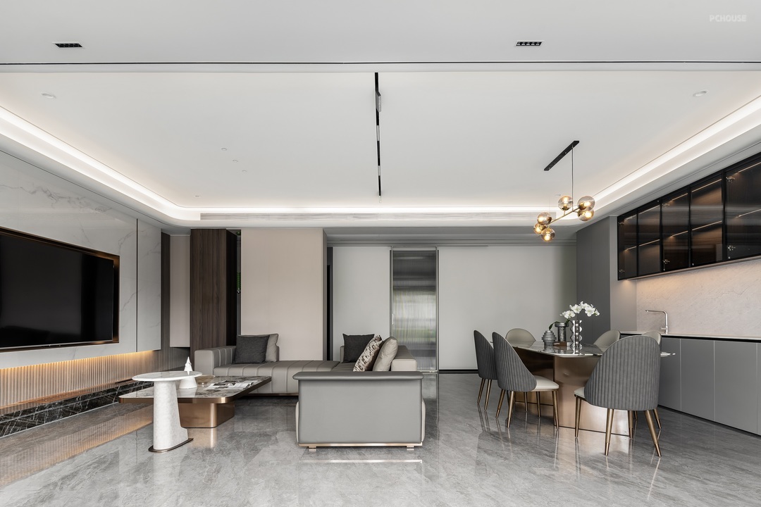 无主灯设计使空间更加通透。900*1800大板砖密封铺贴,无限连纹整体感更强,有大理石地面的奢华感。