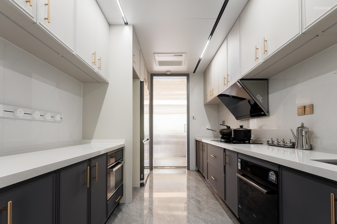 厨房的极简呈现有赖于蜂窝大板吊顶,尚未采购的嵌入式冰箱和立式冰柜等电器设计师都细心为其留好了位置。大吸力抽油烟机、洗碗机作为提升烹饪体验的必备物品,自然也是添置到位了的。