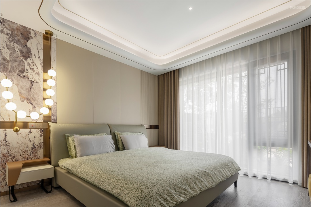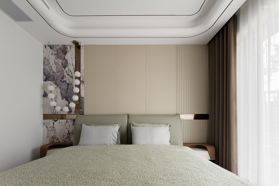 珍珠形吊灯搭配奶油色系的硬包背景墙,将整个卧室氛围糅合得舒适柔软。两边石材纹路与格栅的造型处理避免了墙面过于单一。起居室同款的穹顶处理使得房间环境更显宽敞明亮。