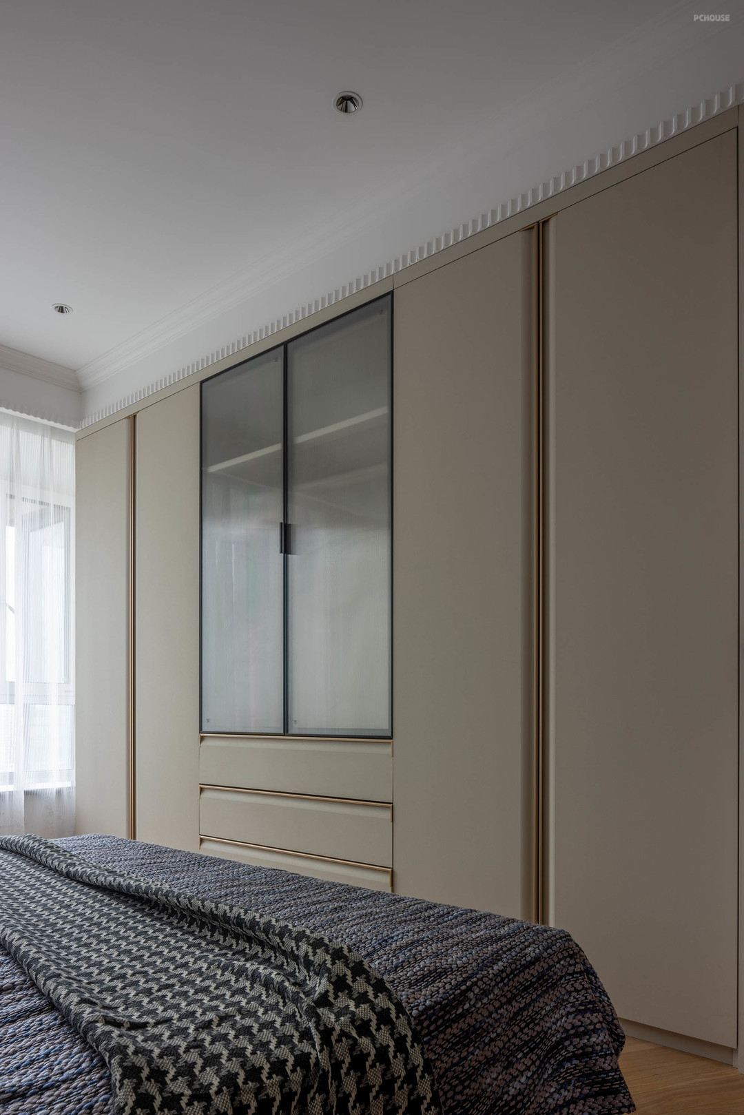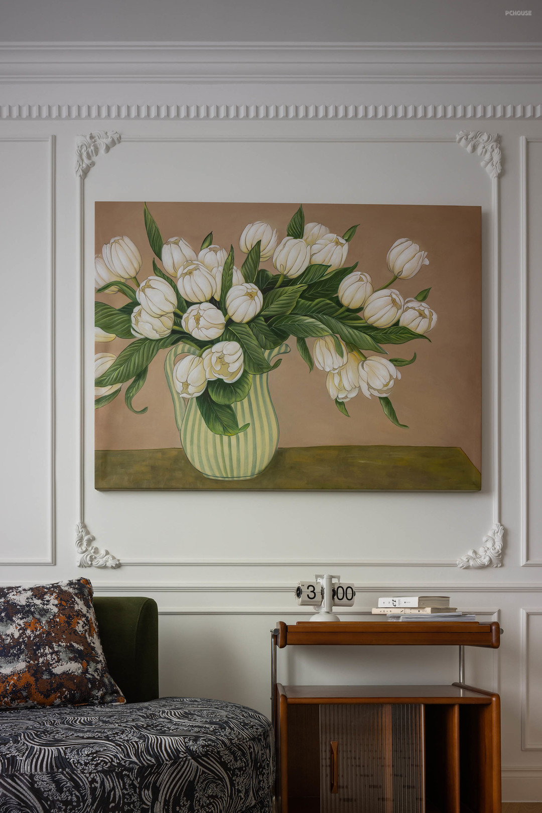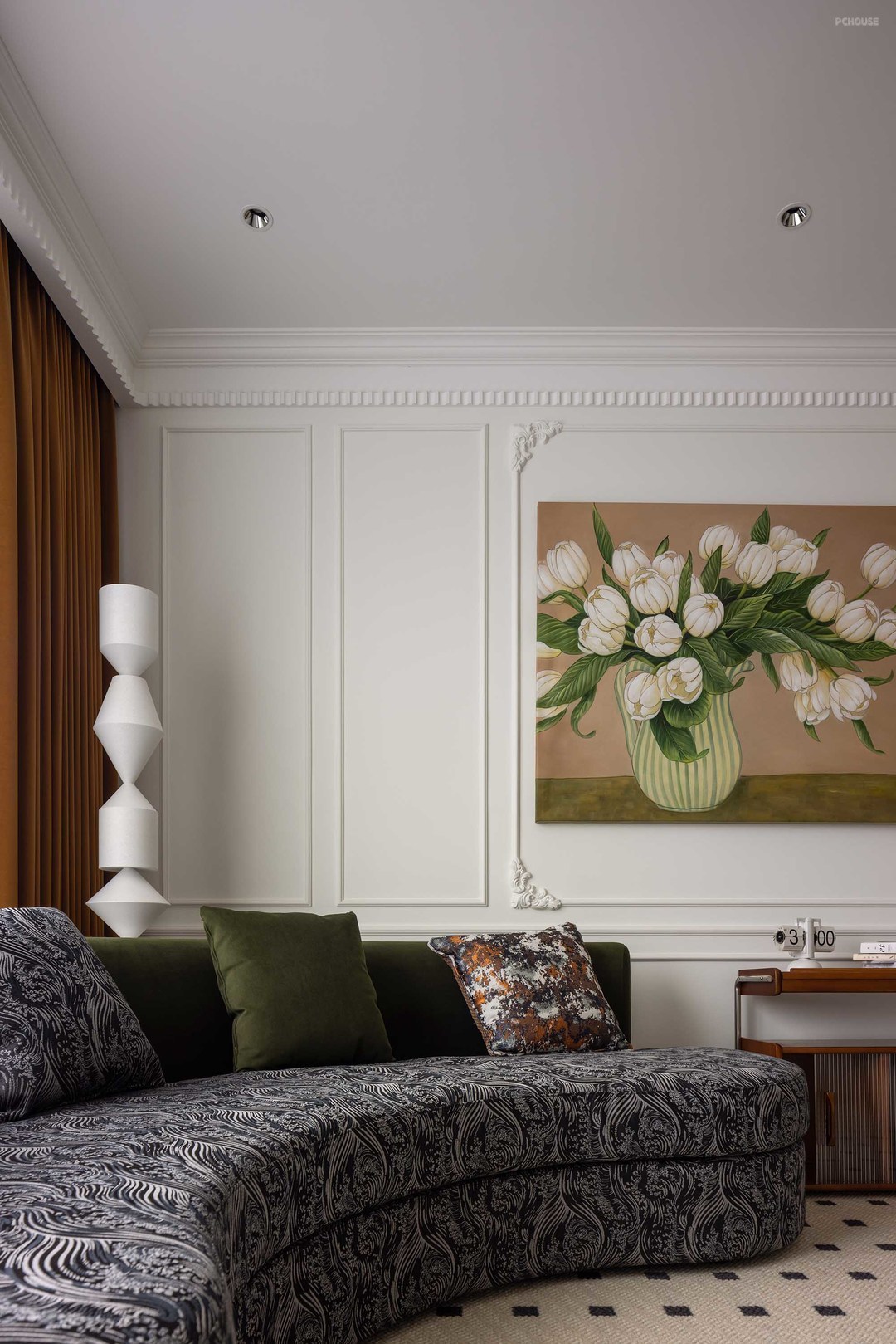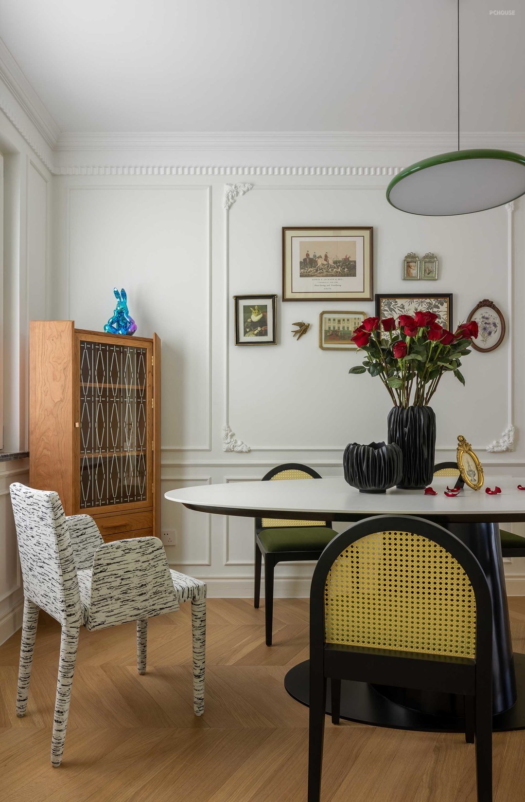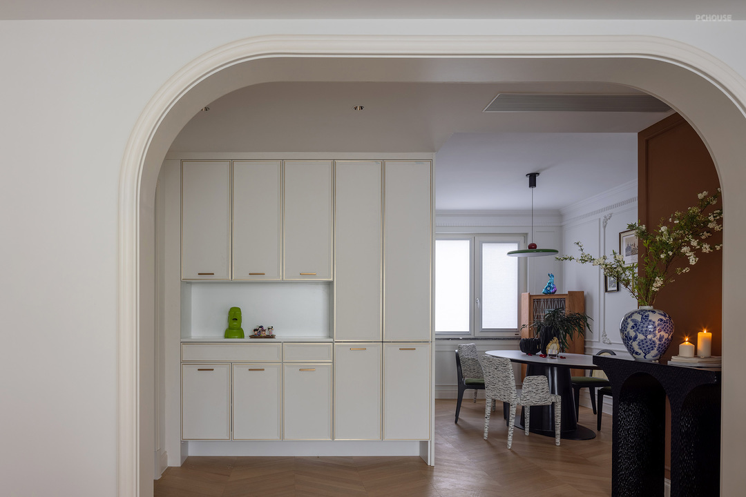 采用对称手法,以石膏线条、雕花、乳胶漆等引出空间柔美生动的一面,跨纬度进行浪漫呼应,阐述客厅的安定基调与轻松意趣。甄选材质来不动声色地凸显肌理质感,搭配中古立柜,让栖居场景更具灵活性。