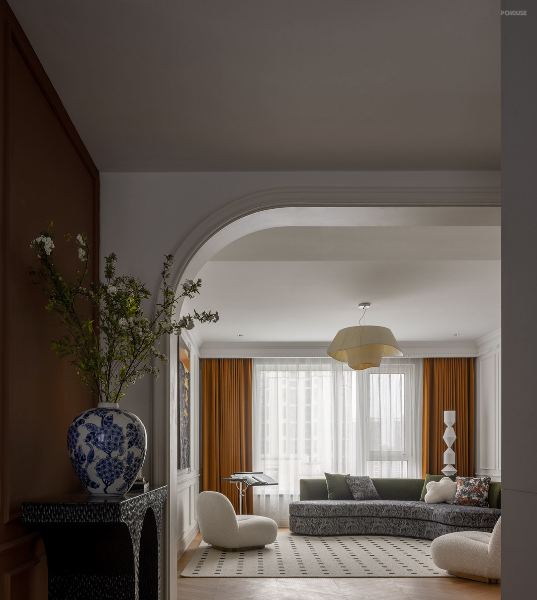 一轮弧线,将公共场域一分为二。门厅向左推进,构筑简约整洁的收纳空间,对话光源充裕的客厅,向前推进,置入棕色调背景、手工雕刻的黑色玄关桌、青花瓷瓶构成画境,点燃香薰蜡烛,达成互通的空间关系。