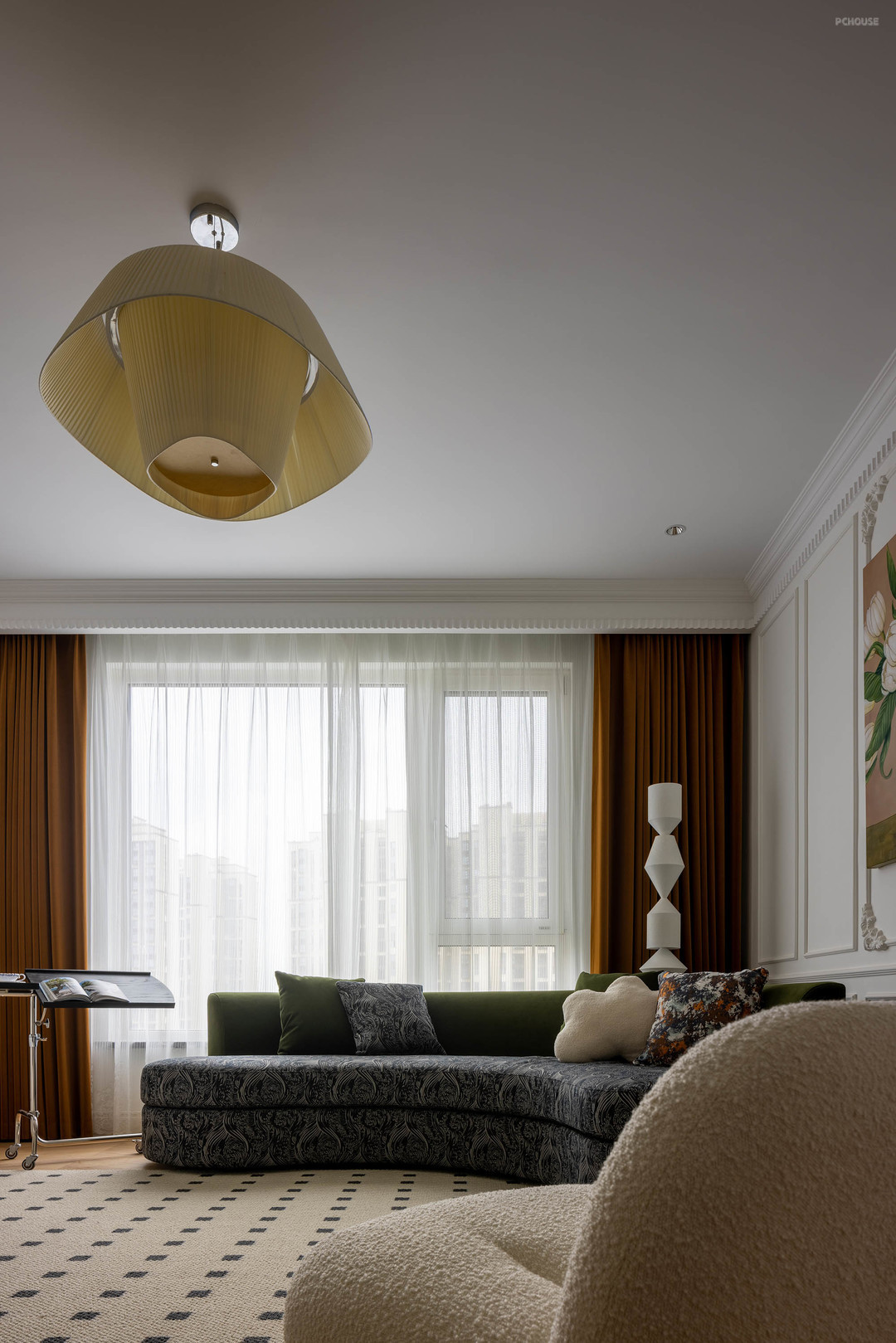 借助光影的强弱变化,平衡主次场域的冷静与热烈。妙用透景手法强化空间的开阔性与层次感。客厅的圆弧沙发,并非分段式,且打破了传统沙发的摆放方式,给予了家人更完整舒适的躺坐体验。