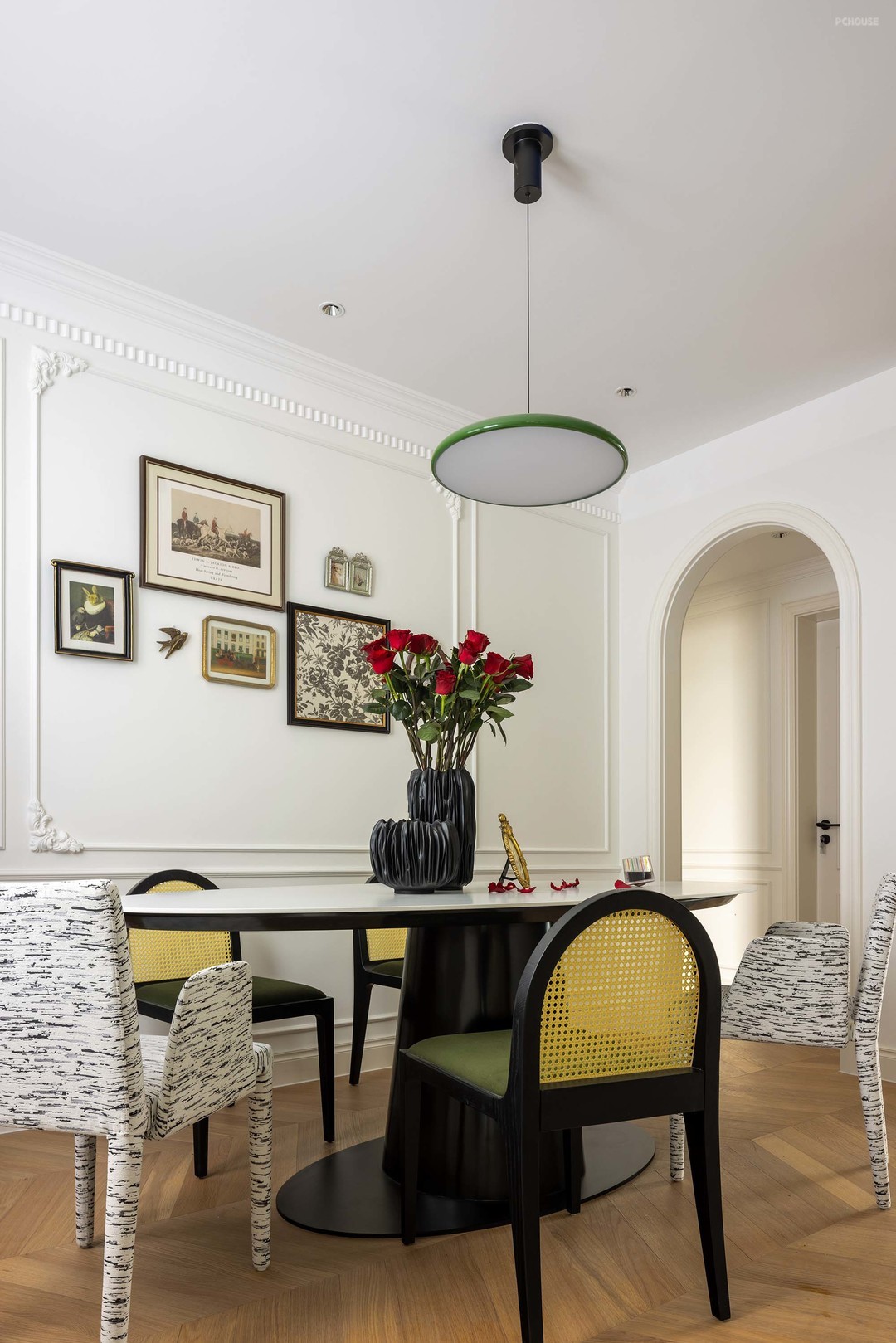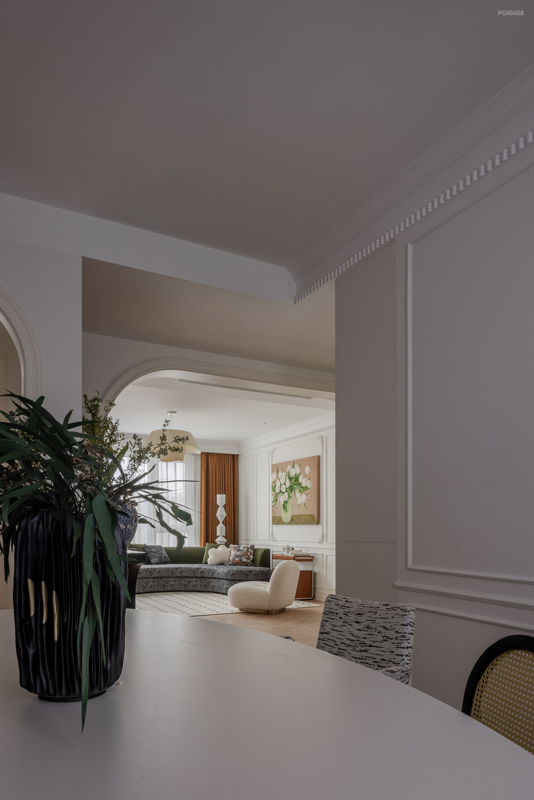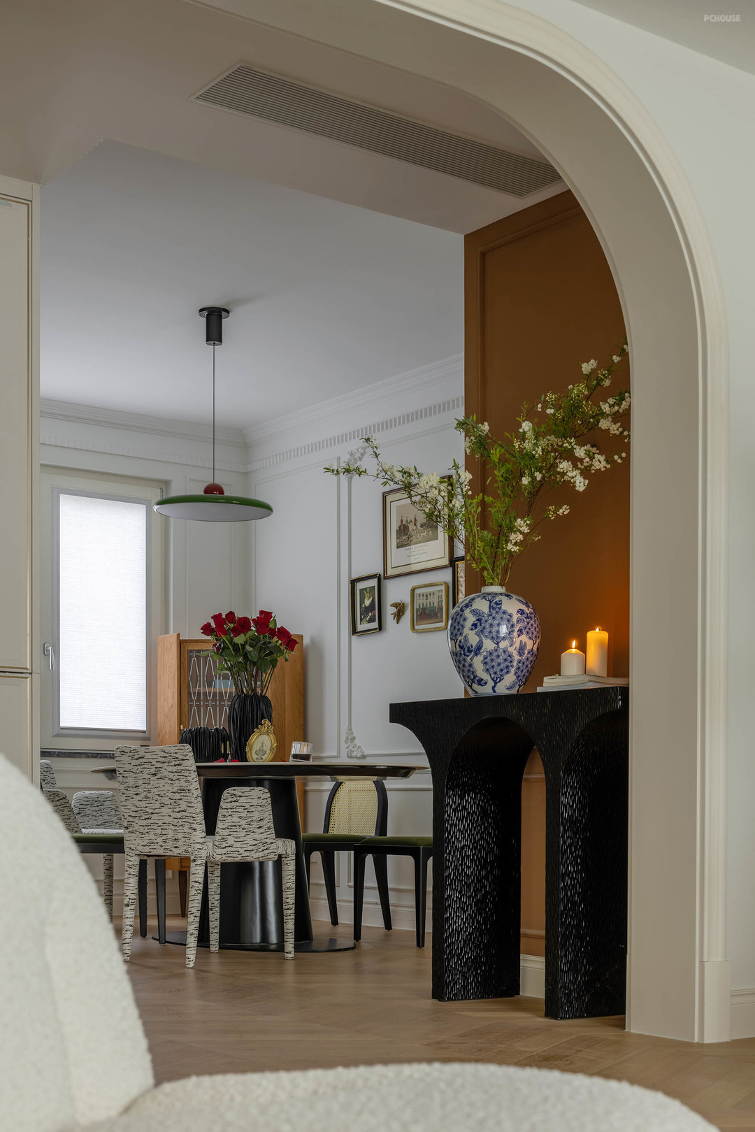拱形,贯穿结构立面与家居陈设,融合不同材质、色彩、工艺与尺度,力求营造和谐体感。黑白水墨的餐椅,是餐厅的点睛之笔,深浅不一的绿色游弋在空间内,给予了餐厅生命力与美学表现力,让人仿佛在花园里就餐。