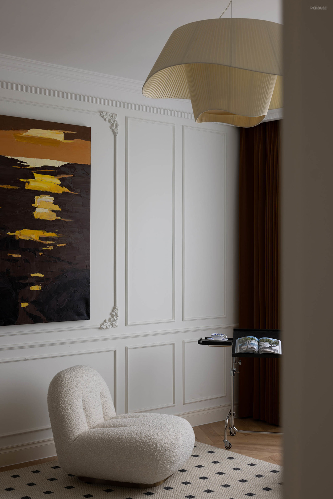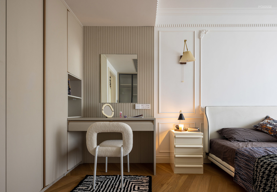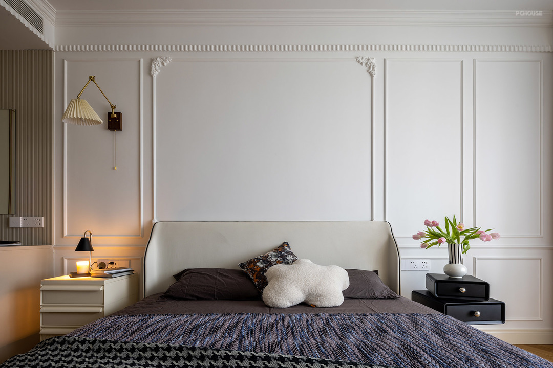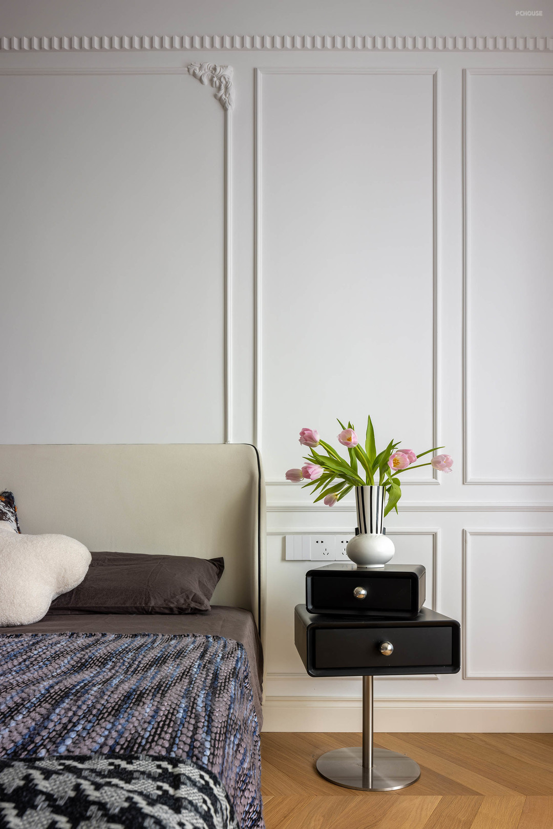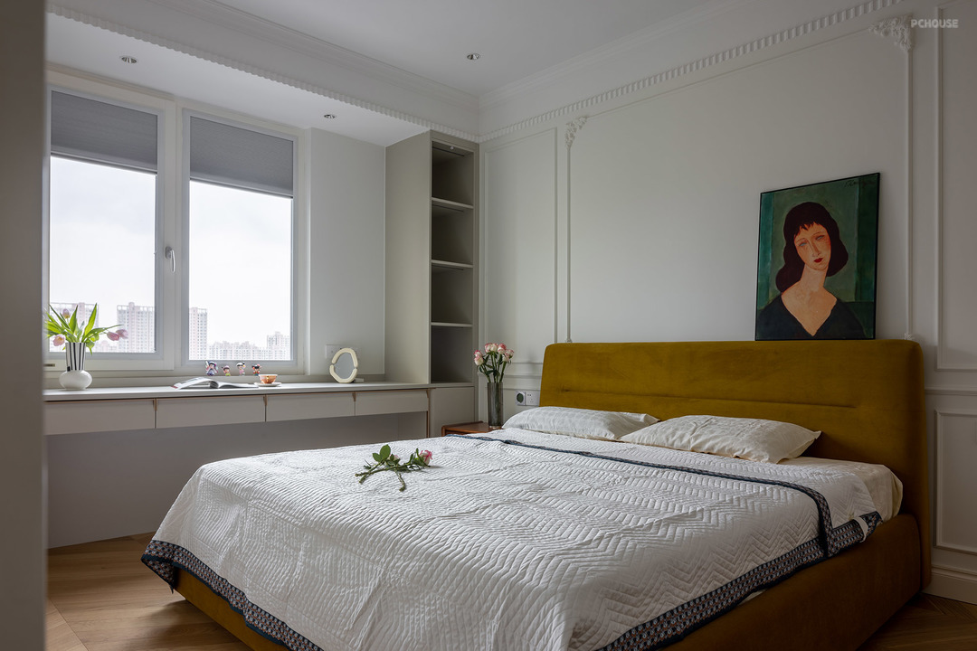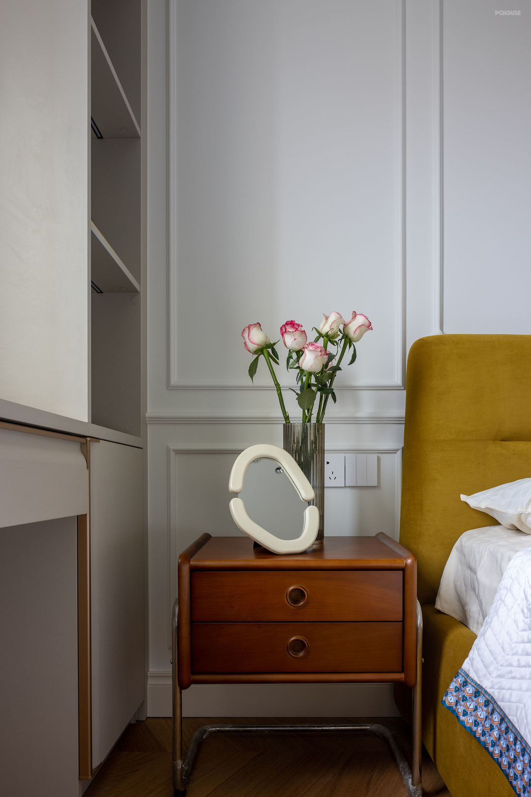 延续法式风情,重塑装饰线的比例,以便区分睡眠区、照明区、梳妆区,安排合理舒适的动静情态。浪漫,是不规则的床头柜,是跳色的窗帘,是柔和的曲线,是光与影、花与你、朝与夕。