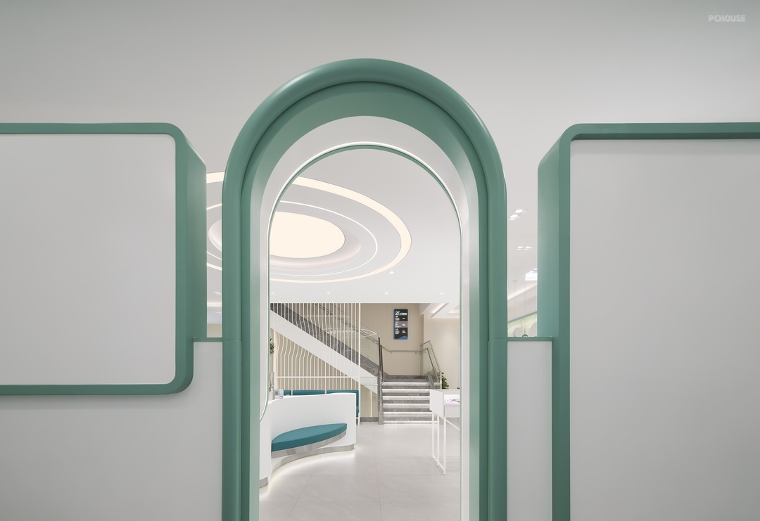 二三层拱门、门框等采用天津眼科VI颜色点缀,色彩运用极富艺术穿透力,让空间环境有了更多的可能性,在温润开阔的空间中形成整体和谐的空间界面。采用留空的弧形门洞结构,拉伸了空间,提升了层次,为顾客提供一个柔和舒适的视光检查空间。