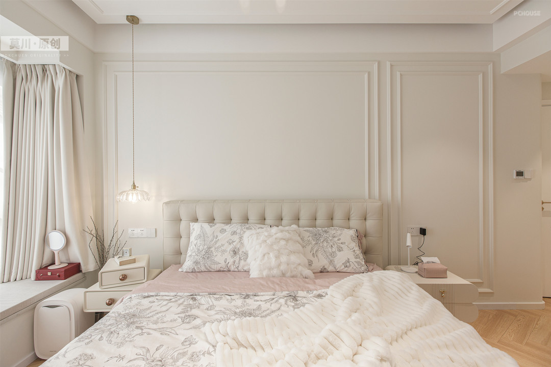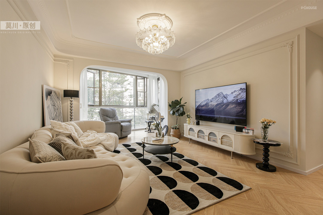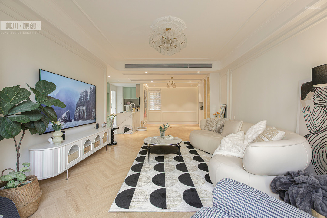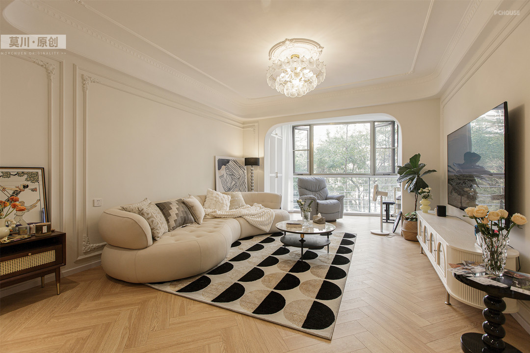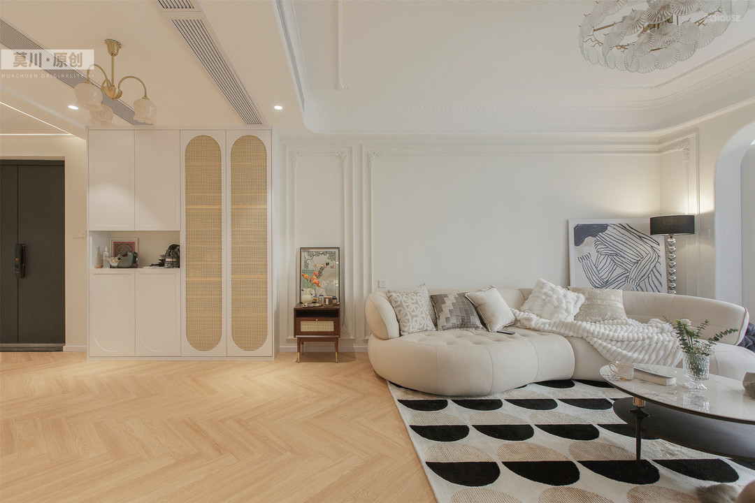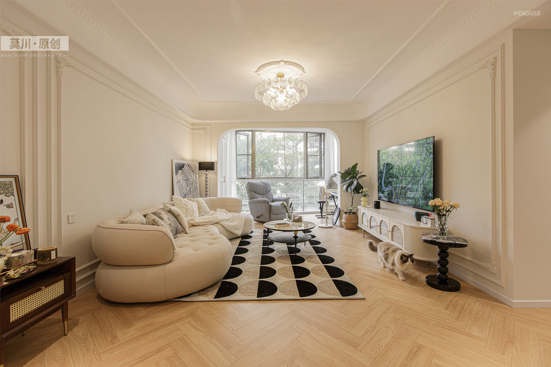 天花走边延续弧形元素,顺滑的转角将墙体生硬感剔除,内外两圈平线,中间一圈钢琴线,三层石膏线的设计,从细节处感受法式精致。视线流转,目光下移,全屋以人字形式铺贴木地板,柔和的奶茶原木色调,铺上蛋白慕斯般绵密细致的绒毛地毯,软乎乎的奶油配色,在雕花灯盘与玻璃吊灯的映衬下,法式氛围油然而生。