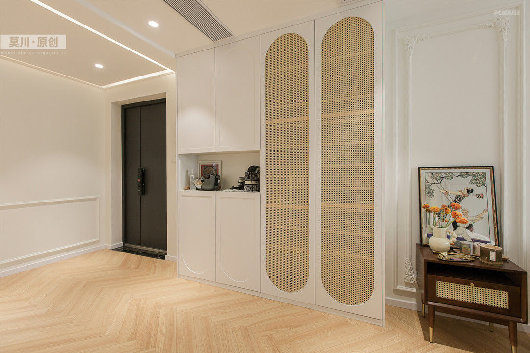 拆除隔墙,无玄关入户方式,一进门感受开阔视野,侧边沿墙面打造整面鞋柜,将烤漆板材结合竹编元素,圆滑的收边巧妙衔接材质,防尘透气之余散发雅致美感。