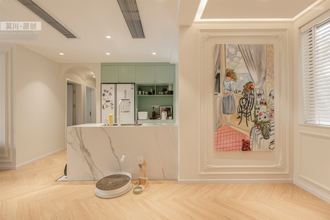 餐厨由封闭过渡至开放式设计,从窗户旁引申墙体连接岩板岛台,石膏线框起浪漫色彩,阳光透过百叶帘倾泻而入,婆娑的光影,寄予对家的热爱。