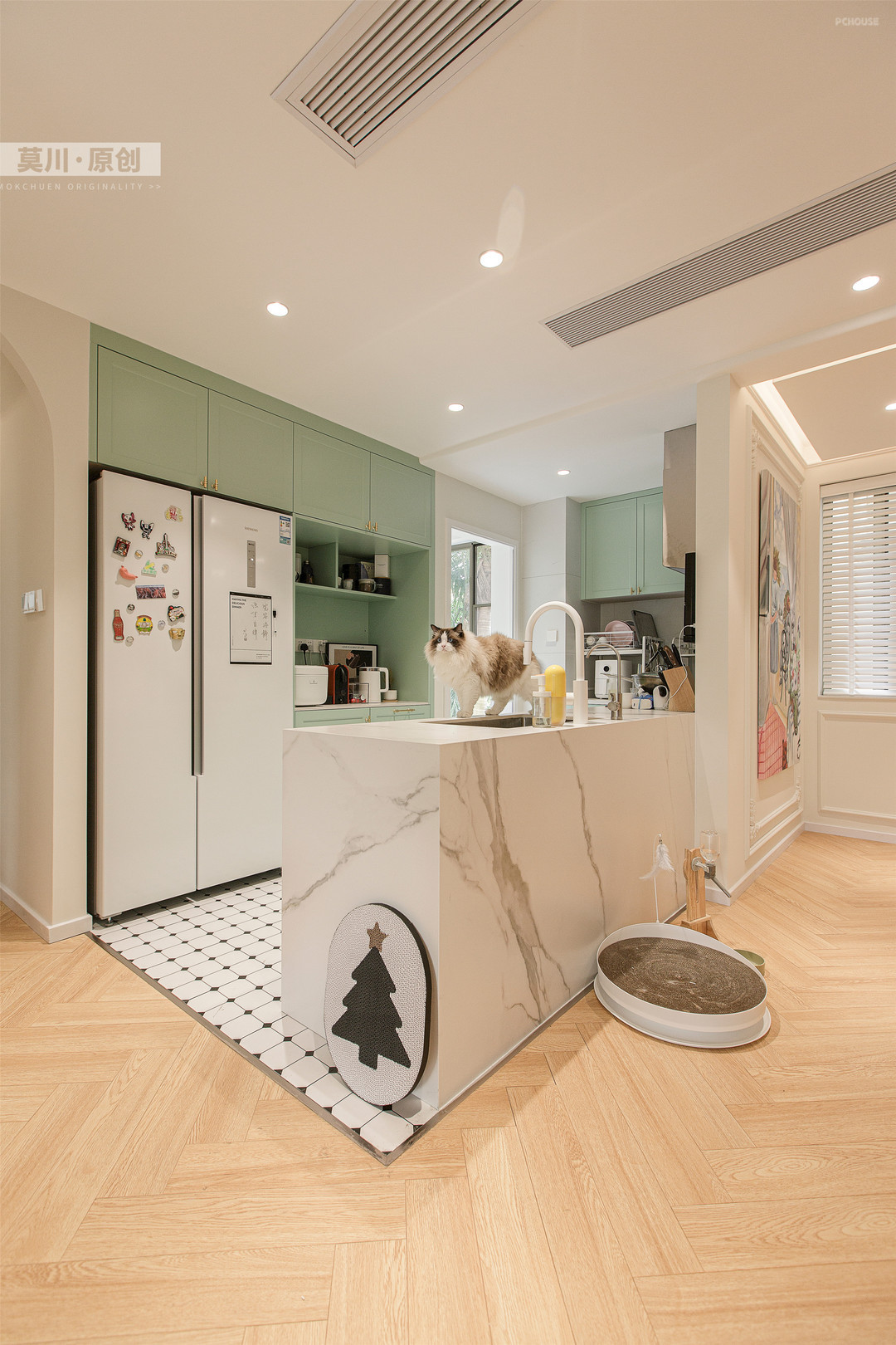 春辰般的绿色描绘厨房的收纳空间,黑白如棋盘一般的小方砖铺就厨房地面,简约清新的色彩如入田园时光,猫咪穿梭其中,恬淡又自由。