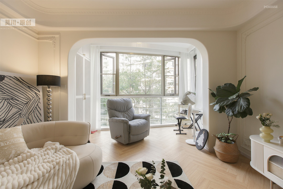 打通客厅和阳台,半径40cm的拱形门洞隐形分隔两个空间,将窗外青葱绿意,框入圆弧当中,感受春天带来的第一抹温柔与惬意。
