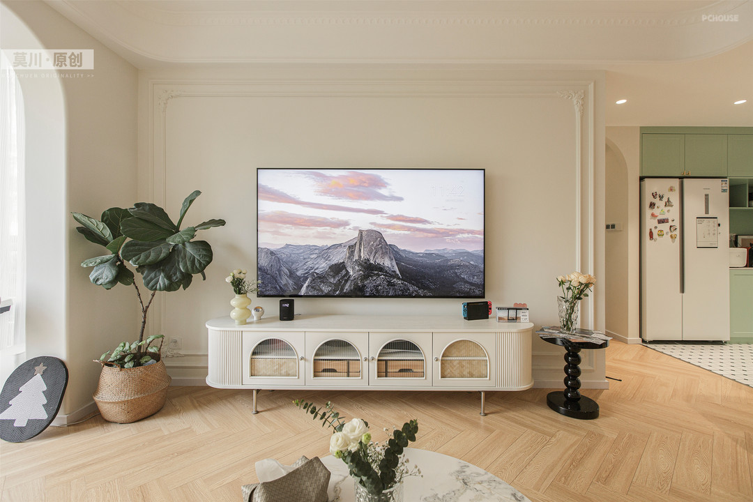 大面积的留白,由两圈石膏线巧做点缀,繁复的角花衔接边角,浮现的线条,让背景拥有强烈的立体感。奶白色哑光烤漆矮柜,4扇拱形条纹压花玻璃柜门,透光不透视,兼具艺术与收纳功能。旁边摆上藤编盆栽和罗马柱边几,复古感浸透全屋。