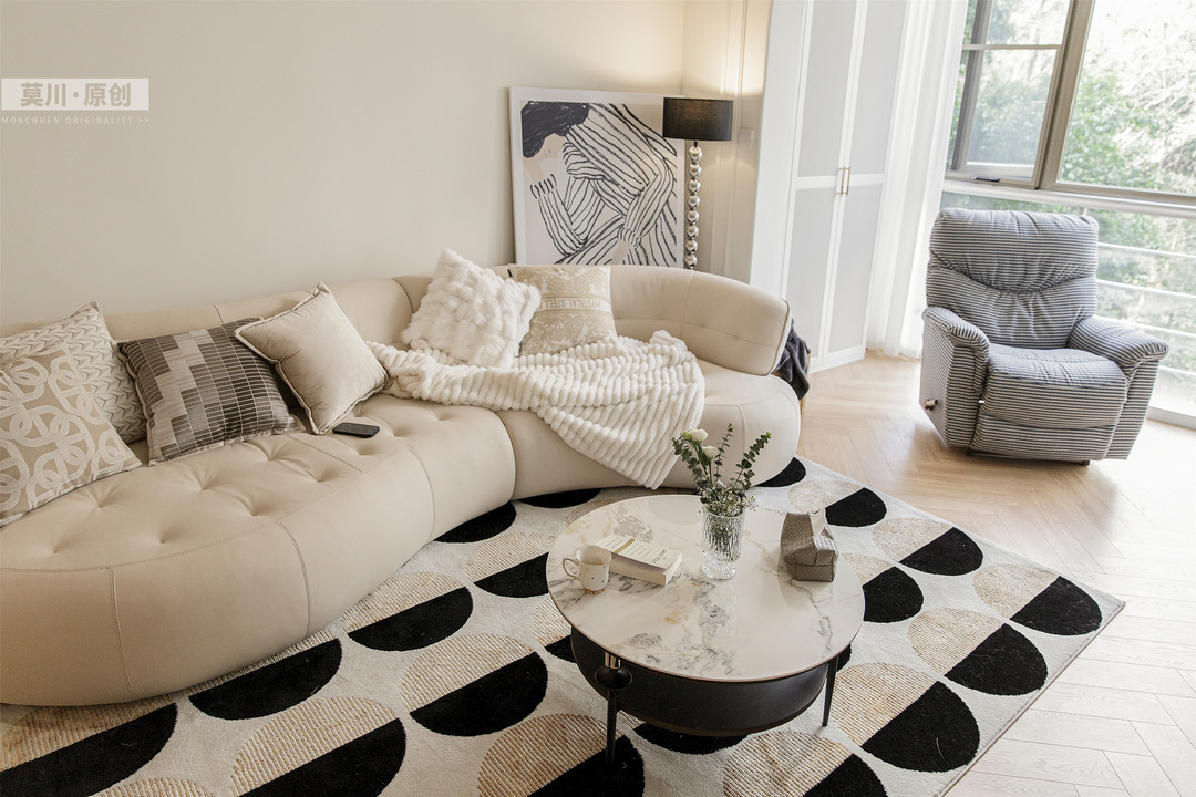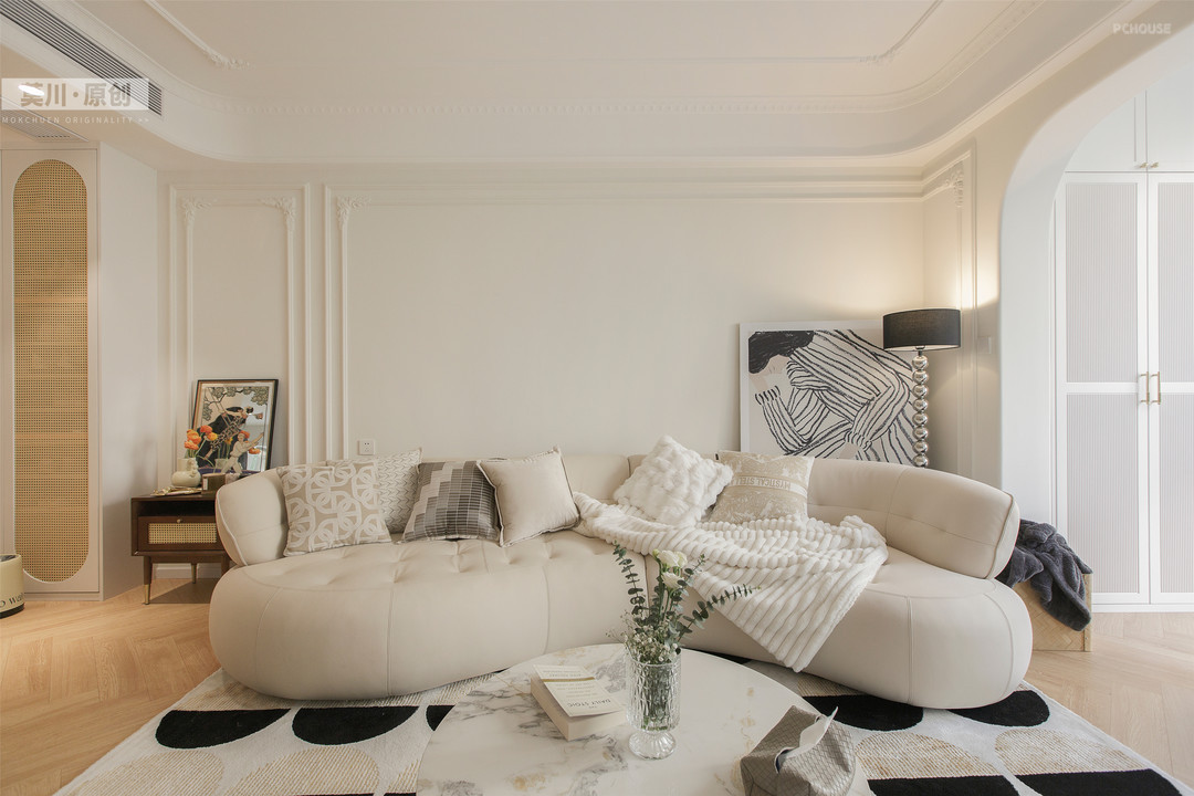 长方线框一大一小拼凑沙发背景,右转向拉伸过渡至夹角墙面,延伸感更强显得空间更大;自带点点灰蒙调的芡实白色弧形沙发,半磨砂的牛皮材质,在视觉与触觉上同步肉感和绵柔,软中又带筋骨,丰富坐感层次;背后放上胡桃木藤编小茶几和黑色系的落地灯,既与一侧的鞋柜互相联系,又与对向电视背景遥相对话,延续法式氛围的精髓。