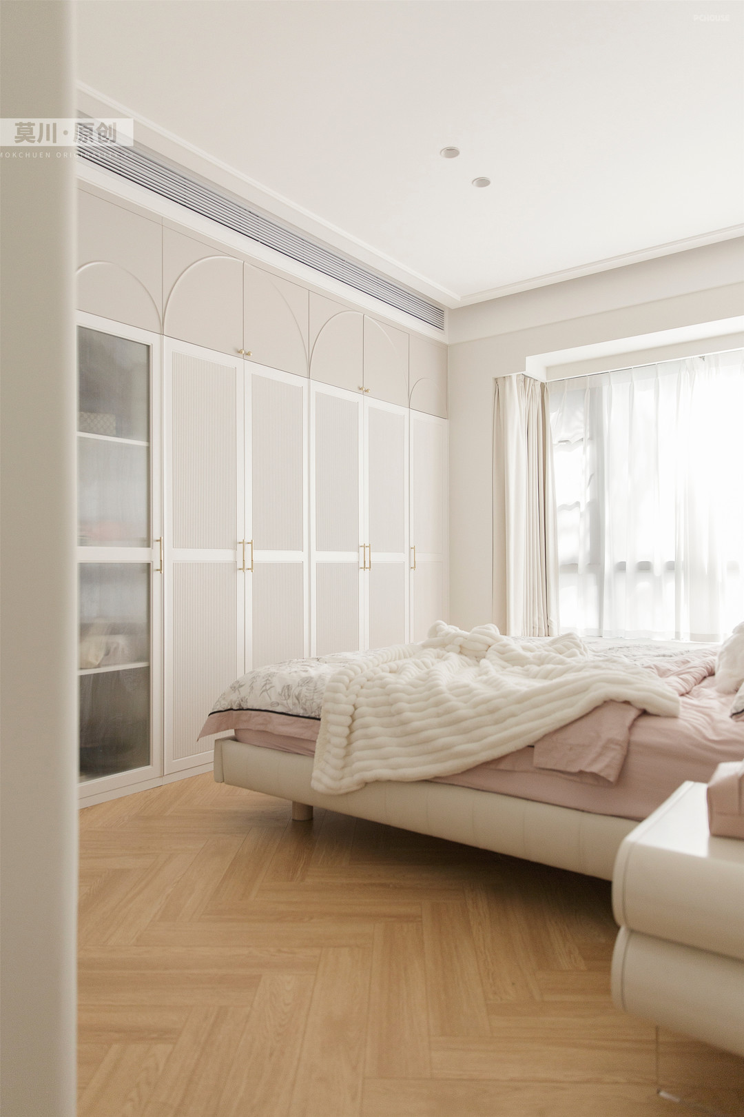 衣柜倚墙而建,整面的收纳拉满储物能力,分隔式设计,上方选择大象灰肤感烤漆面板,以拉手为中心画半圆线条定制柜门造型,用来收纳不常使用的冬季床品;下方选择浅色奶油质感格栅门,中间留有一组柜子做玻璃门,材质的丰富填充,减弱视觉疲劳,简约的造型营造出法式的浪漫慵懒。