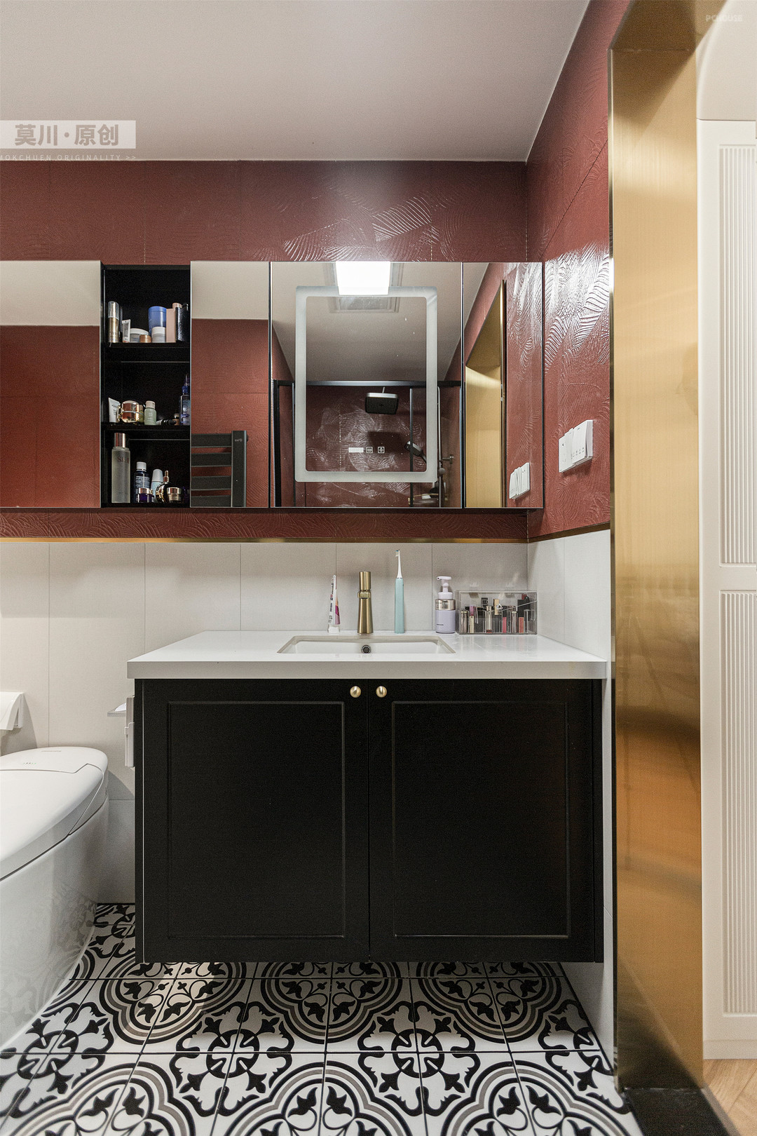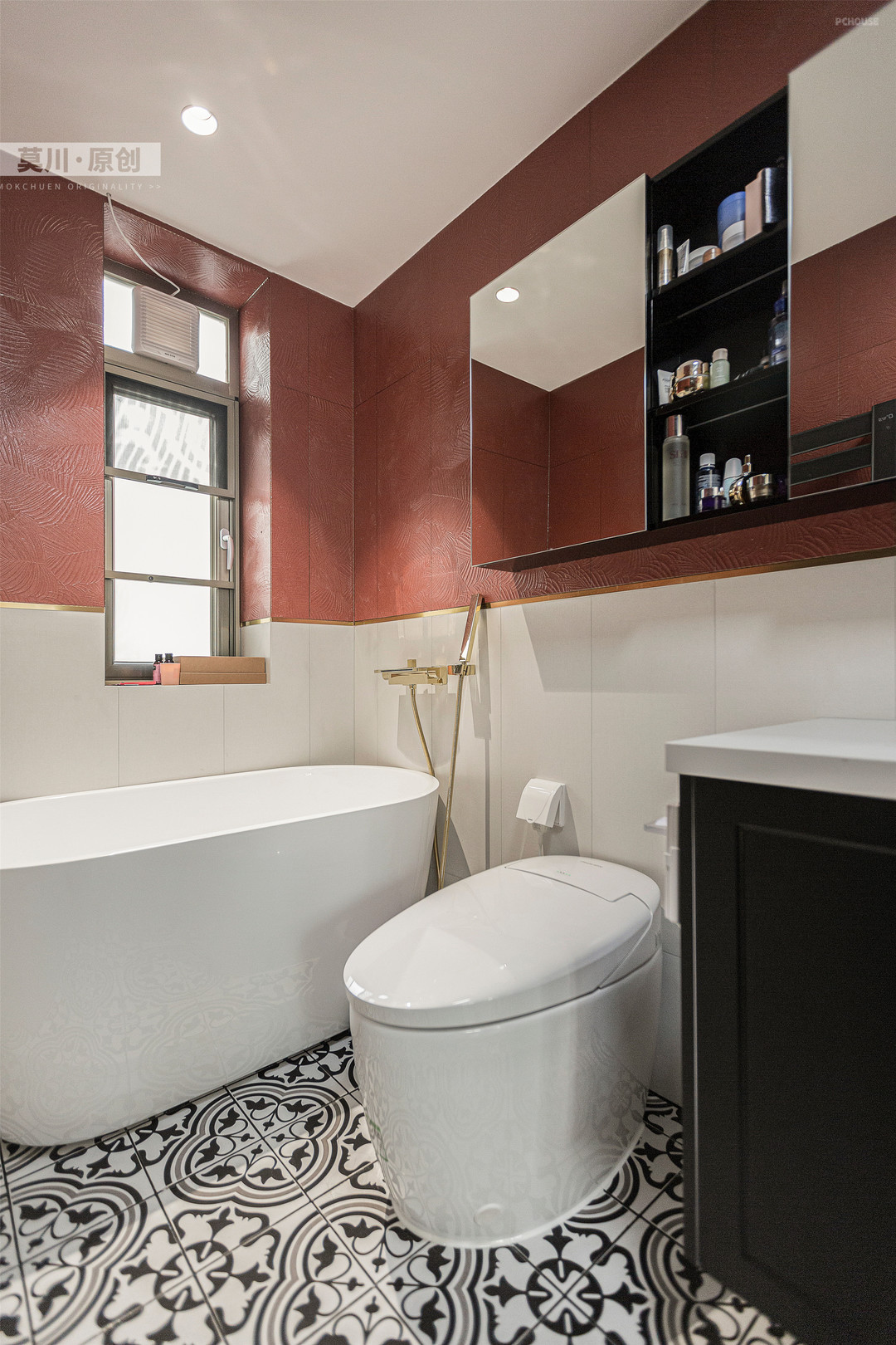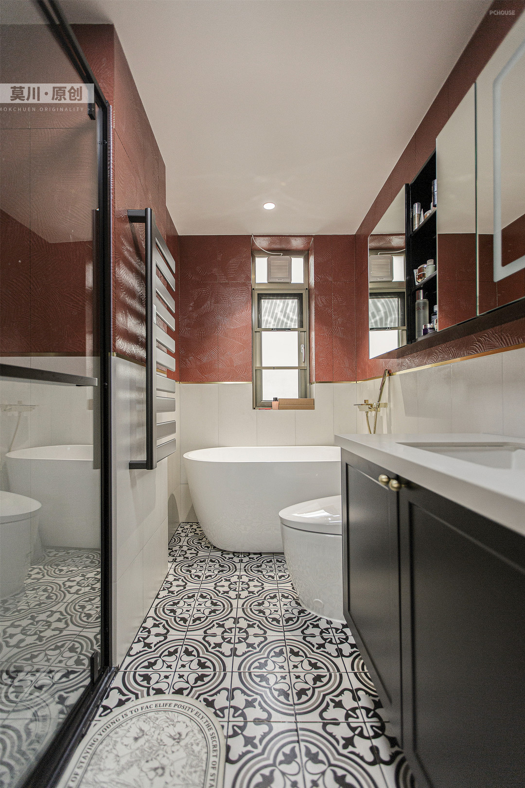 一反清新调色,用红色与花砖包裹套卫,热情与复古感充盈空间,空间表现力更强。将洗手池移位,内置浴缸,淋浴区划入原格局进门方向,合理的规划使小套卫也能拥有丰富的卫浴功能。