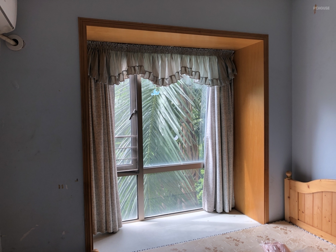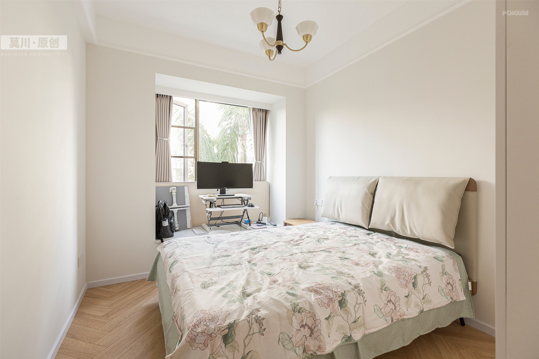 将原有灰蓝色墙面替换成乳白色,用雅致素净的碎花与浅绿色勾勒房间,铃兰吊灯莹莹闪烁,温馨又不失恬淡;飘窗架上移动支板,放上显示屏轻松搭建一处小型办公区,偶尔起身看看室外,烦恼和疲惫都能消散。