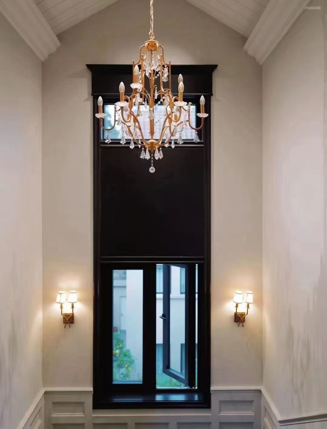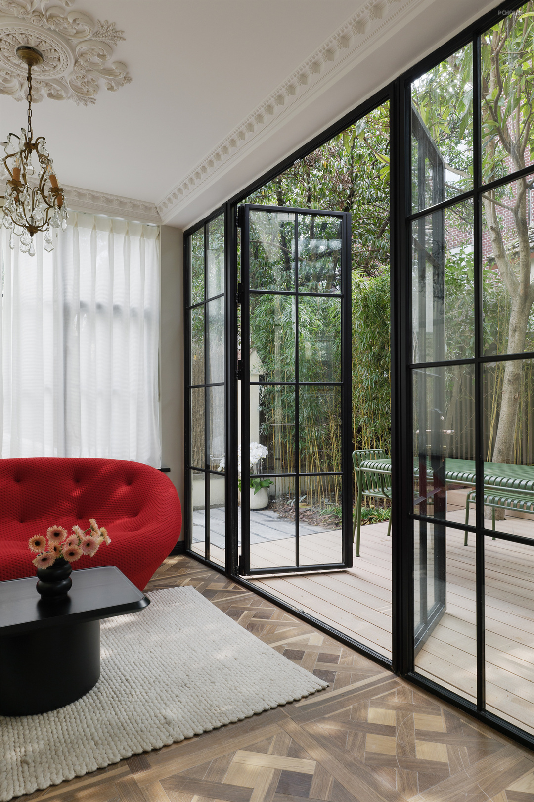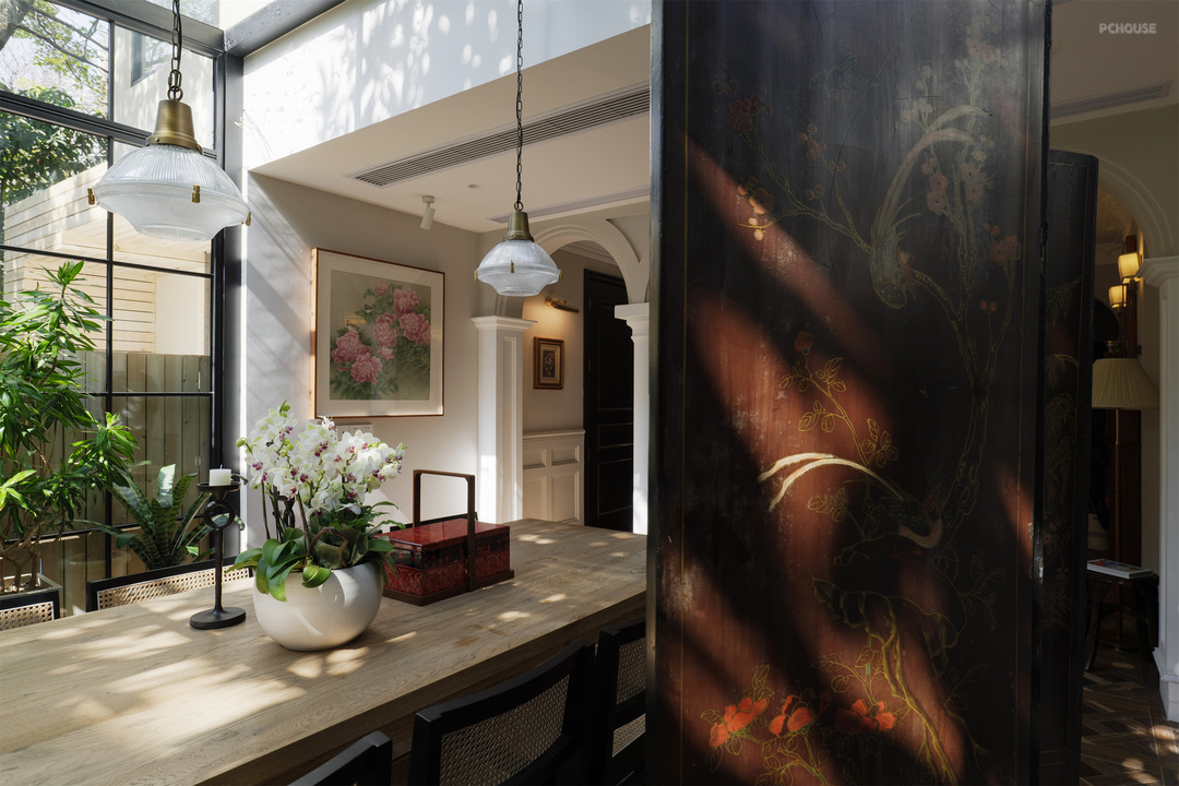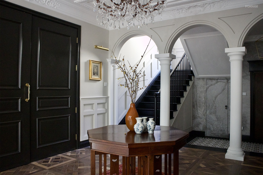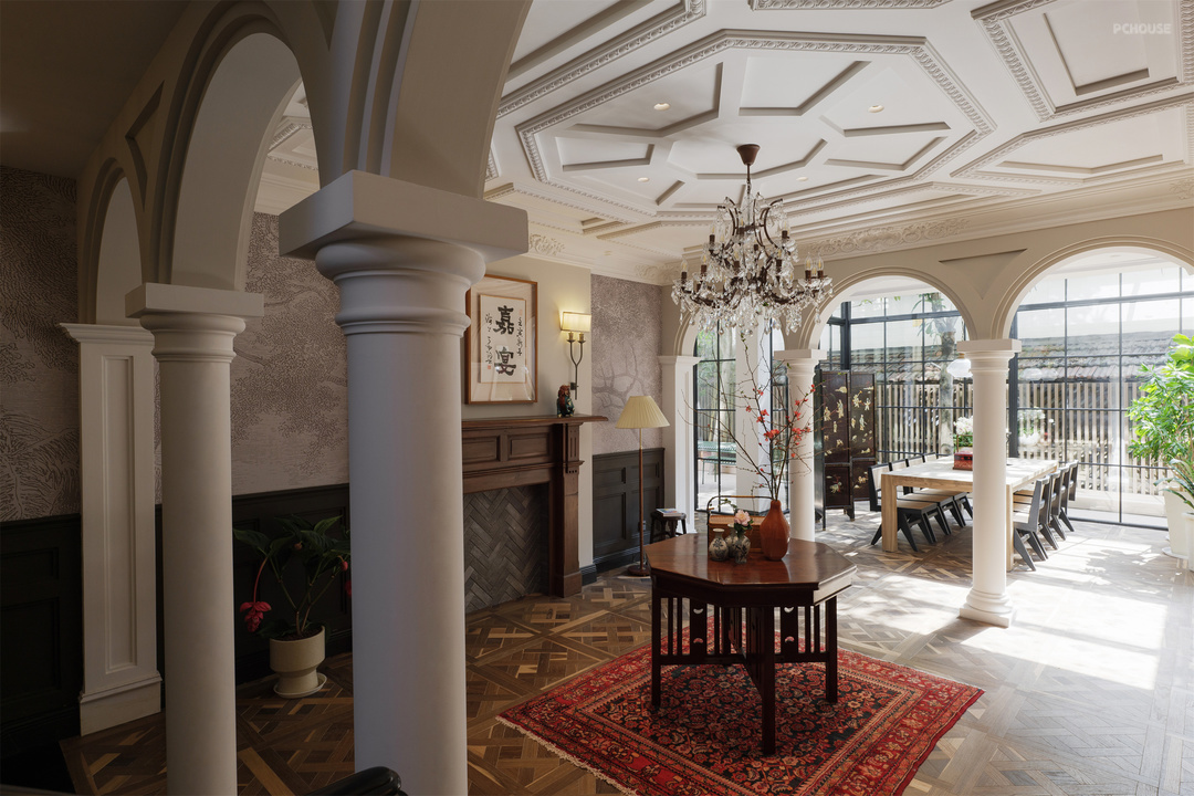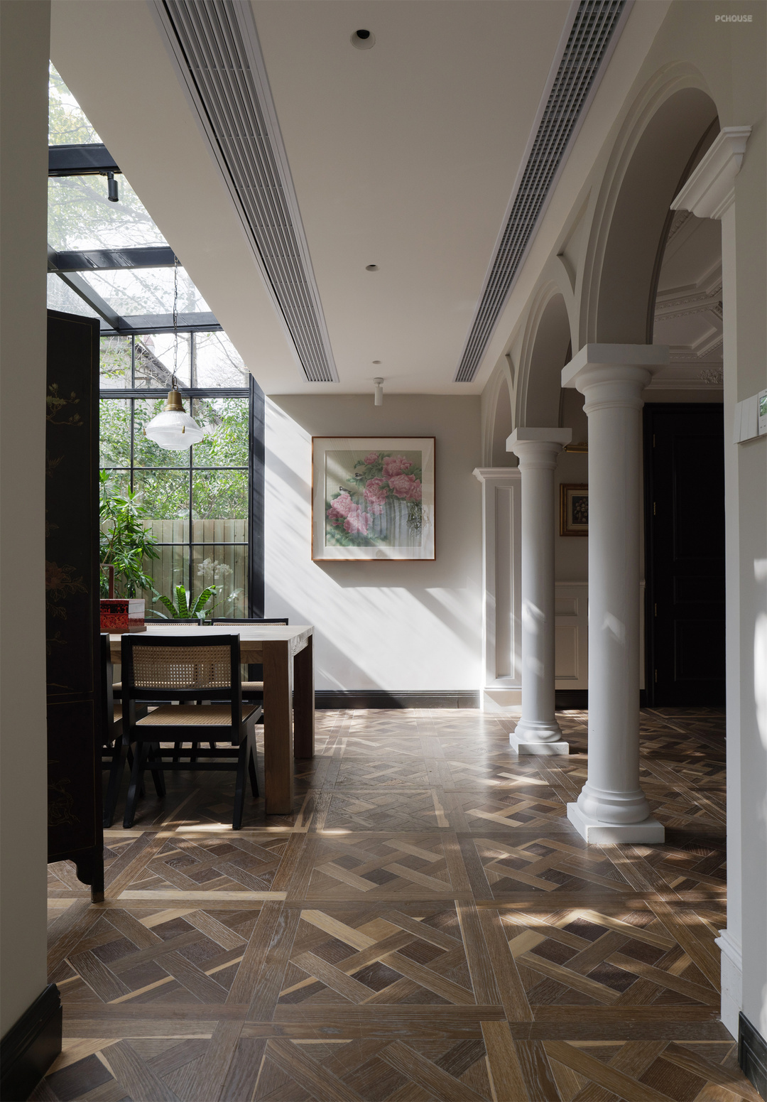 我们改造的第一步就是把玻璃阳光房原来的灰色铝合金窗全部换成极具老上海风情的黑色老钢窗,再结合拼花木地板、老式花砖、拱券门廊、雕花石膏线、罗马柱、护墙板等元素,完成了海派风格在硬装上的呈现。